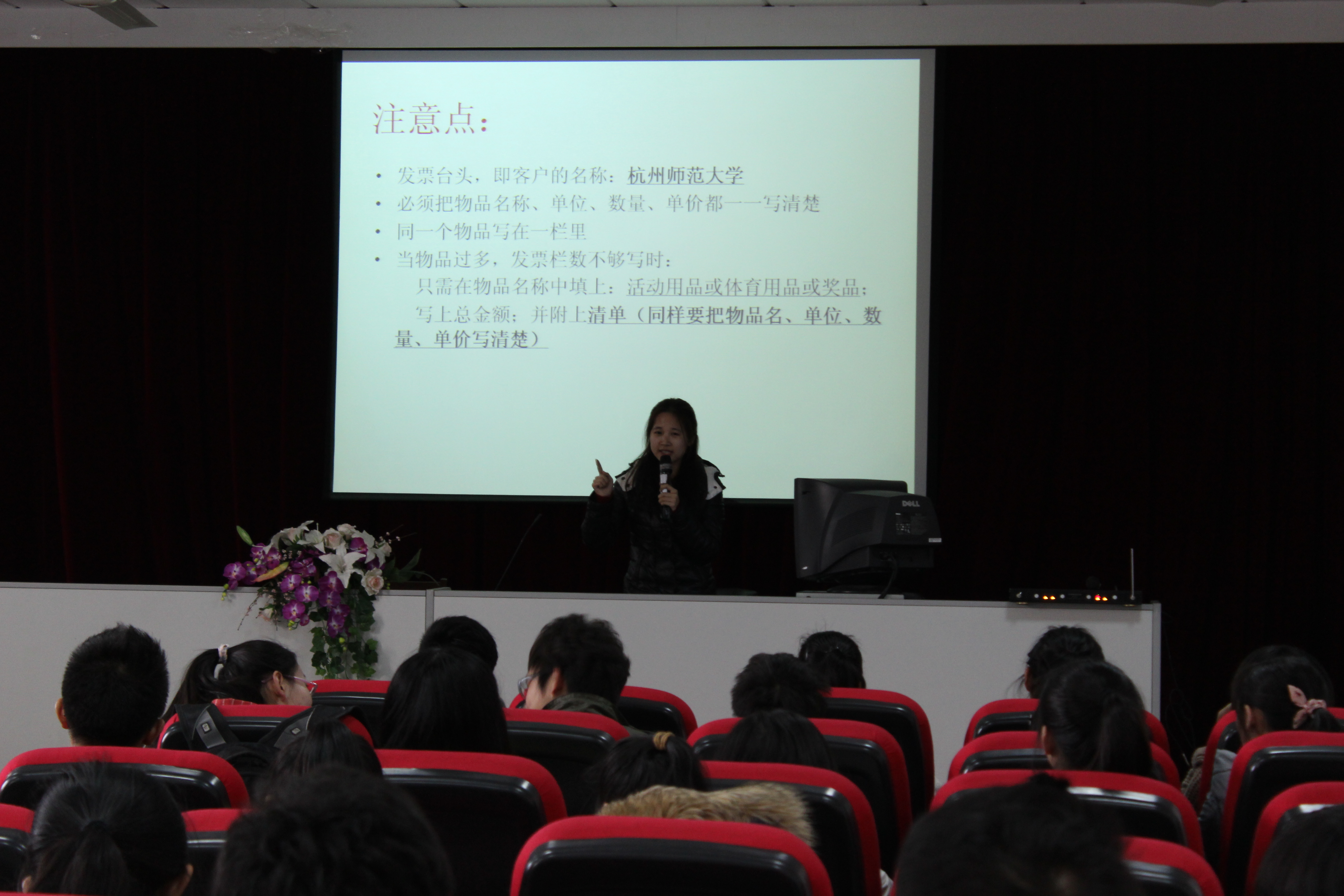 首先,办公室主任郑雅就“如何开发票”给大家讲了许多注意事项,十分有条理地从七个注意点入手,大家都受益匪浅。紧接着,副主席蒋金妙为大家介绍了学校学院,以及学生会的概况和各部门职能。副主席潘燕燕别出心裁,向大家讲授了关于“礼仪与沟通”方面的知识。而学生会另一副主席朱砂砂以电视剧《天堂之吻》引入话题,一个“真心”引起了在座所有人的深思。用真心做事,做真心的事。此外,她还给大家带来了温馨提示,在多变的天气环境下要多多注意身体。最后,主席杨启航,以自身的经历经验和大家分享了有关“面试”需注意的问题。他结合事实,为大家亮起了一盏启明灯。在杨启航主席的总结下,本次干部干事培训会落下了帷幕。