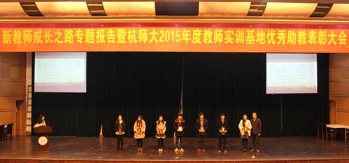 紧接着是2015年度杭师大优秀助教表彰环节。首先接受表彰的是来自理学院的章盼盼等七位助教,理学院党委副书记应金飞老师上台为优秀助教颁奖。来自数学143班的王梦杰同学作为优秀助教代表进行了发言。作为助教班班长,他笑称自己是沟通助教与新星教育双方的桥梁。经过各种突发事件的锻炼,他的应变能力、沟通能力都得到了很大的提升,而这在书本中是无法习得的。