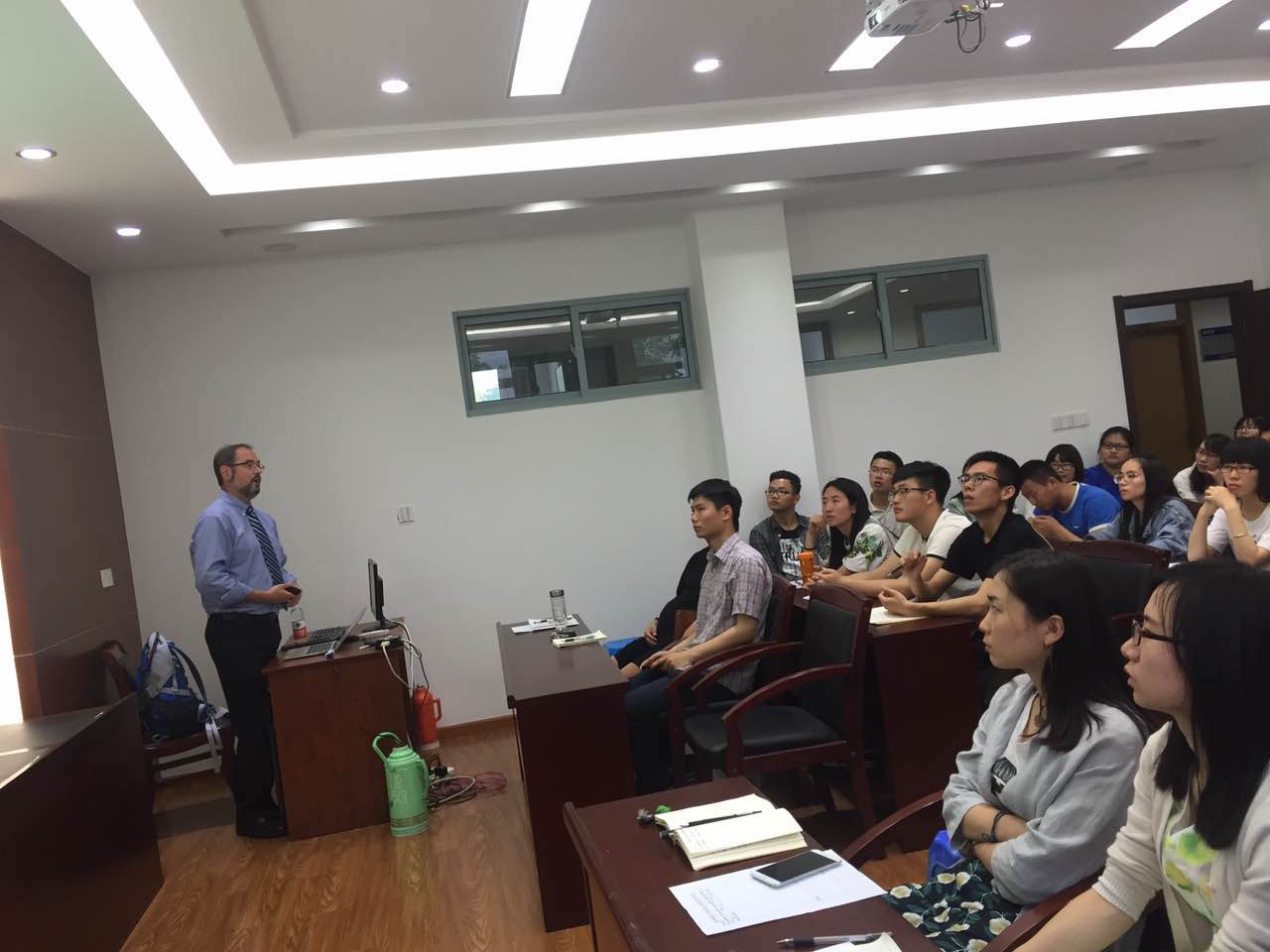 Jon Star教授的研究方向为初、高中学生的数学学习,特别是代数方面。目前主要研究学生在数学问题解决中解题灵活性的形成与培养,灵活性即解决数学问题的多种方法、对待某一特定问题能够自觉地从多种方法选出一种合适的方法的能力。讲座中,教授从数学教育心理学研究视角出发,深入浅出地向在座师生介绍了学生在代数学习过程中,问题解决灵活性的现状及培养的系列研究。同时提出了今后相关研究方向。教授对中学数学教学的解读及其在中学数学教育研究中体现的规范性与严谨性让在座师生感受颇深。讲座结束后,教授亲切地与同学们进行交流,大家对知识的渴望远大于地域与语言的差异,现场气氛活跃。