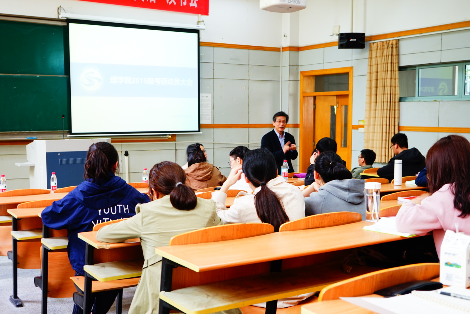 4月18日下午13:00,理学院在D101组织了考研动员大会,理学院2015级有意向考研的同学、应物171(专升本)班级有考研意向的同学参加大会,理学院副院长韩丹夫、党委副书记应金飞、毕业班班主任、辅导员出席会议。韩丹夫老师和应金飞老师先后进行了2014级考研结果的公布、考研情况的分析,明确了学院的鼓励和支持,为在座的学生开展考研动员活动,表达了对大家的信任和期望。