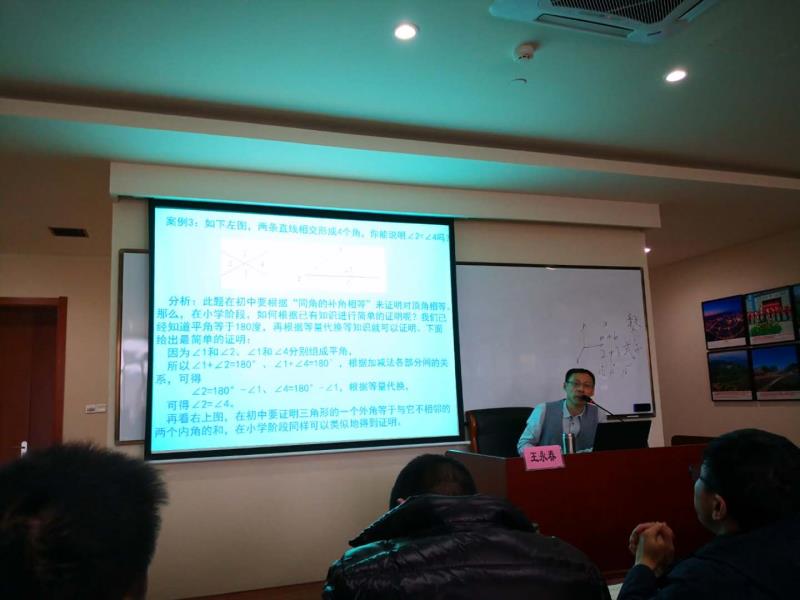 接下来,本次研修的第一场讲座专家——人民教育出版社小学数学编辑室王永春教授为全体学员作了“小学数学核心素养与数学思想方法”的专题讲座。王教授从高中数学课程标准谈起,深入浅出地介绍了小学数学核心素养体系。他特别强调:培养具有数学素养的人,应从数学认知、思想能力、个人发展三个维度构建小学数学核心素养,并结合理论、文献、教材、案例等进行详尽的论述。