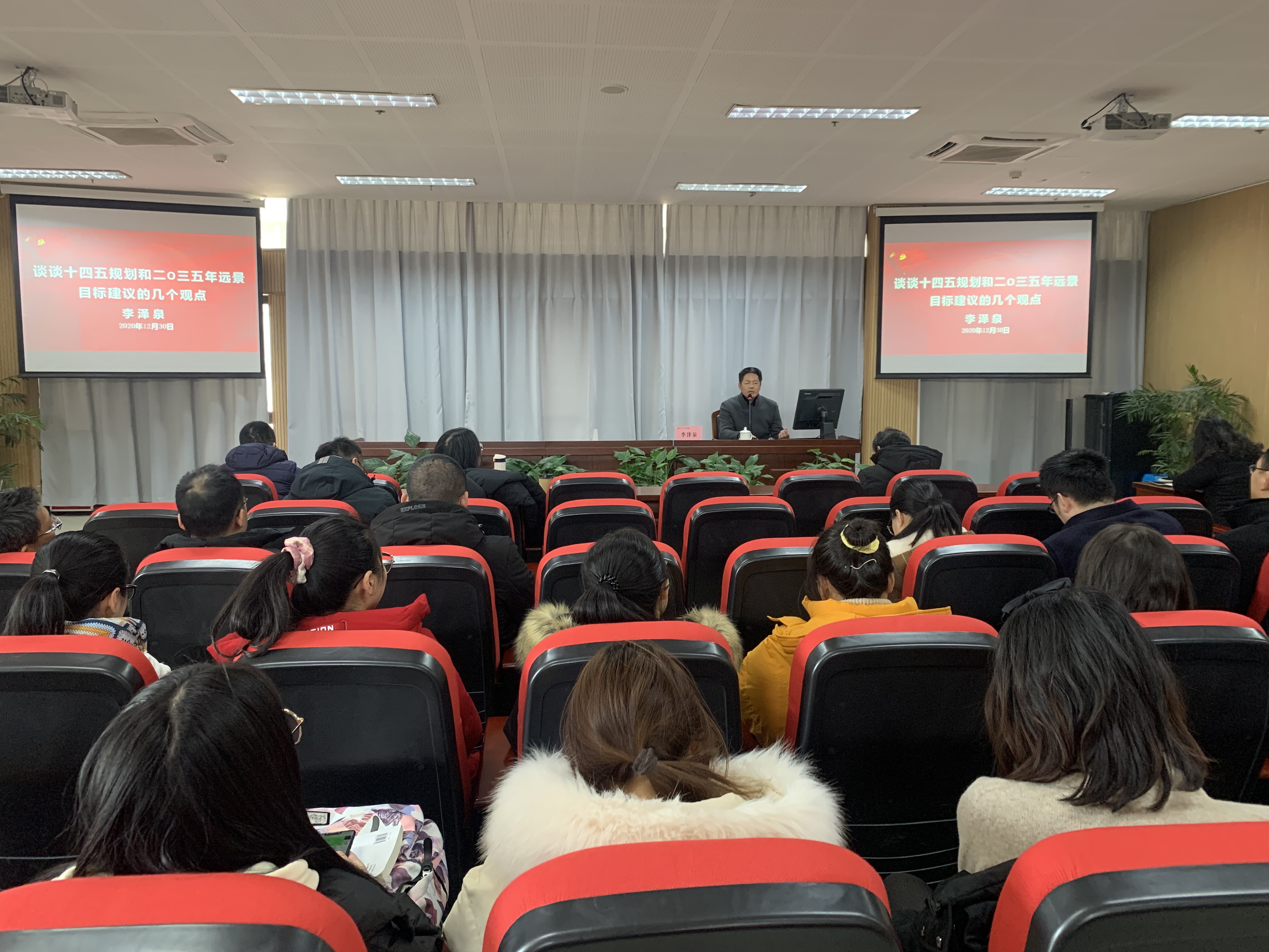 为了更好地学深悟透十九届五中全会精神,12月30日,校纪委书记李泽泉应邀来黄色电影 作“谈谈‘十四五规划’和二〇三五年远景目标建议的几个观点”的报告,为学院教工党员解读五中全会精神。报告由学院党委书记王淑君主持,学院全体党委委员,理学院、生科院、材化学院的党支部书记、支委和部分党员参加了此次报告会。