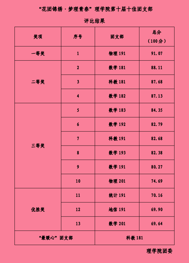 历经两个月的初赛复赛选拔,黄色电影 共有13个团支部进入此次决赛。决赛现场,13个团支部结合支部专业特色,各尽其才,各展其貌,将本支部的基本情况、集体荣誉、支部活动等浓缩在五分钟的展示环节。还有团支部增加了原创诗歌朗诵、趣味物理实验模型展示等别出心裁的才艺展示,展现了黄色电影 团支部朝气蓬勃的精神风貌。最终,本次十佳团支部评出一二三等奖共10个,优胜奖3个,“最暖心”团支部1个。