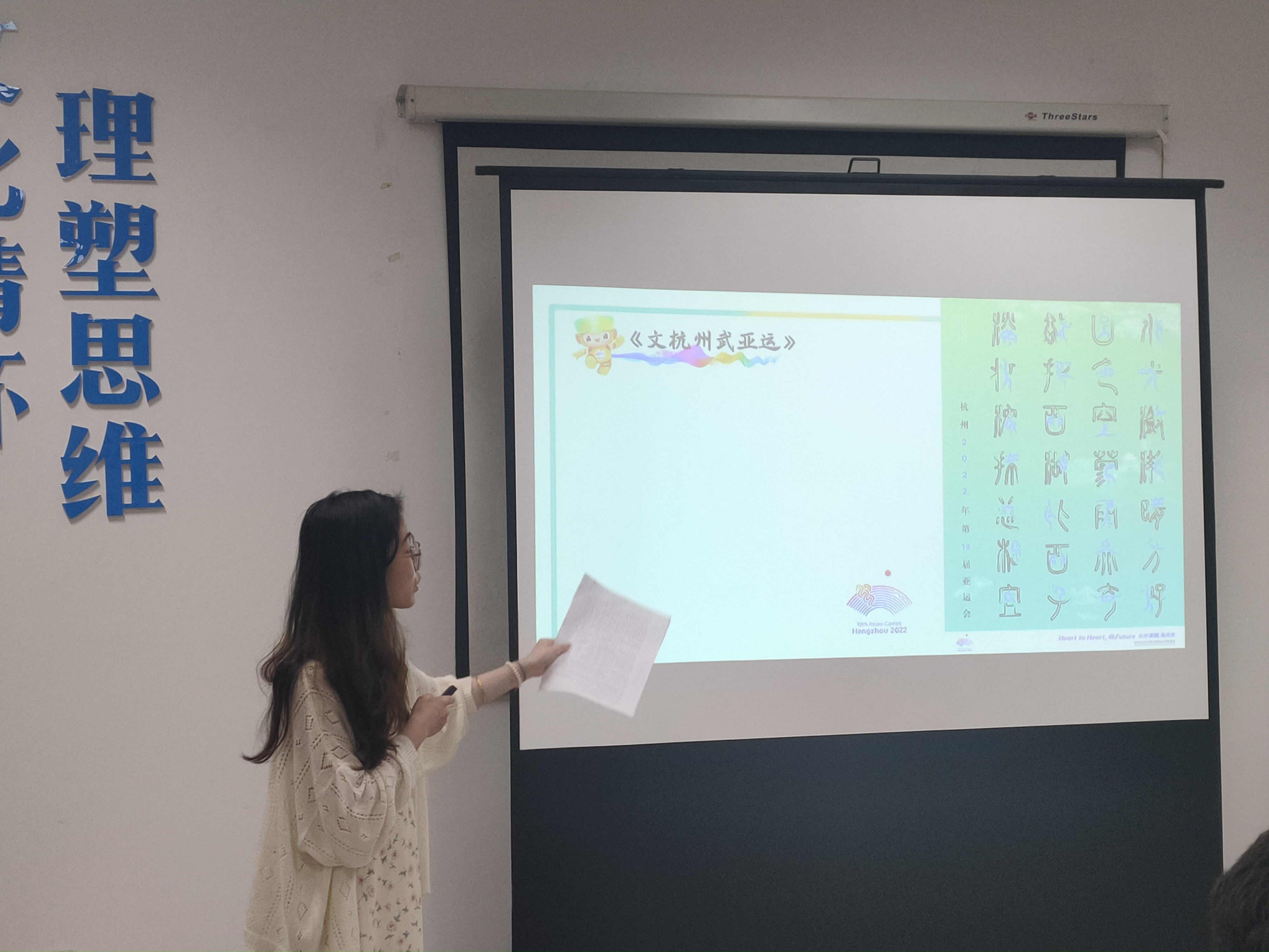 陈沁霞从“杭州亚运口号”、“各界亚运口号”、“口号背后蕴含的意义”,三个方面分别展开介绍。亚运口号不仅是每个时代的缩影,更铭刻着一代又一代人关于亚运的期待和记忆。从“永运向前”到“亚洲能量”,再到“心心相融,@未来”,亚运会被赋予新的使命,口号成为承载共同愿景的重要载体。