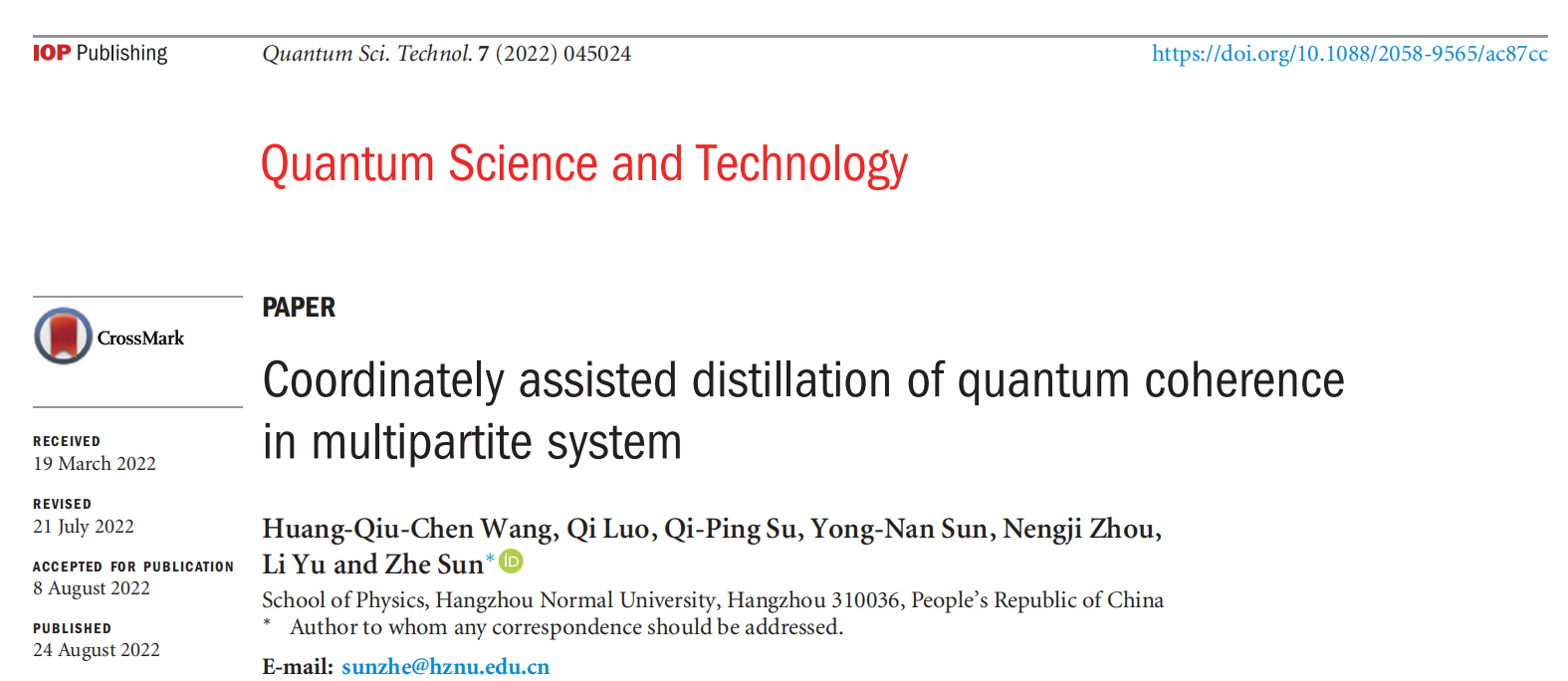 近日,黄色电影 量子信息与量子光学创新团队孙哲教授及团队成员在多体量子系统中的辅助相干蒸馏研究方面取得成果,在英国物理协会(IOP)旗下权威期刊《Quantum Science and Technology》(IF:6.568)发表题为“Coordinately assisted distillation of quantum coherence in multipartite system”学术论文。