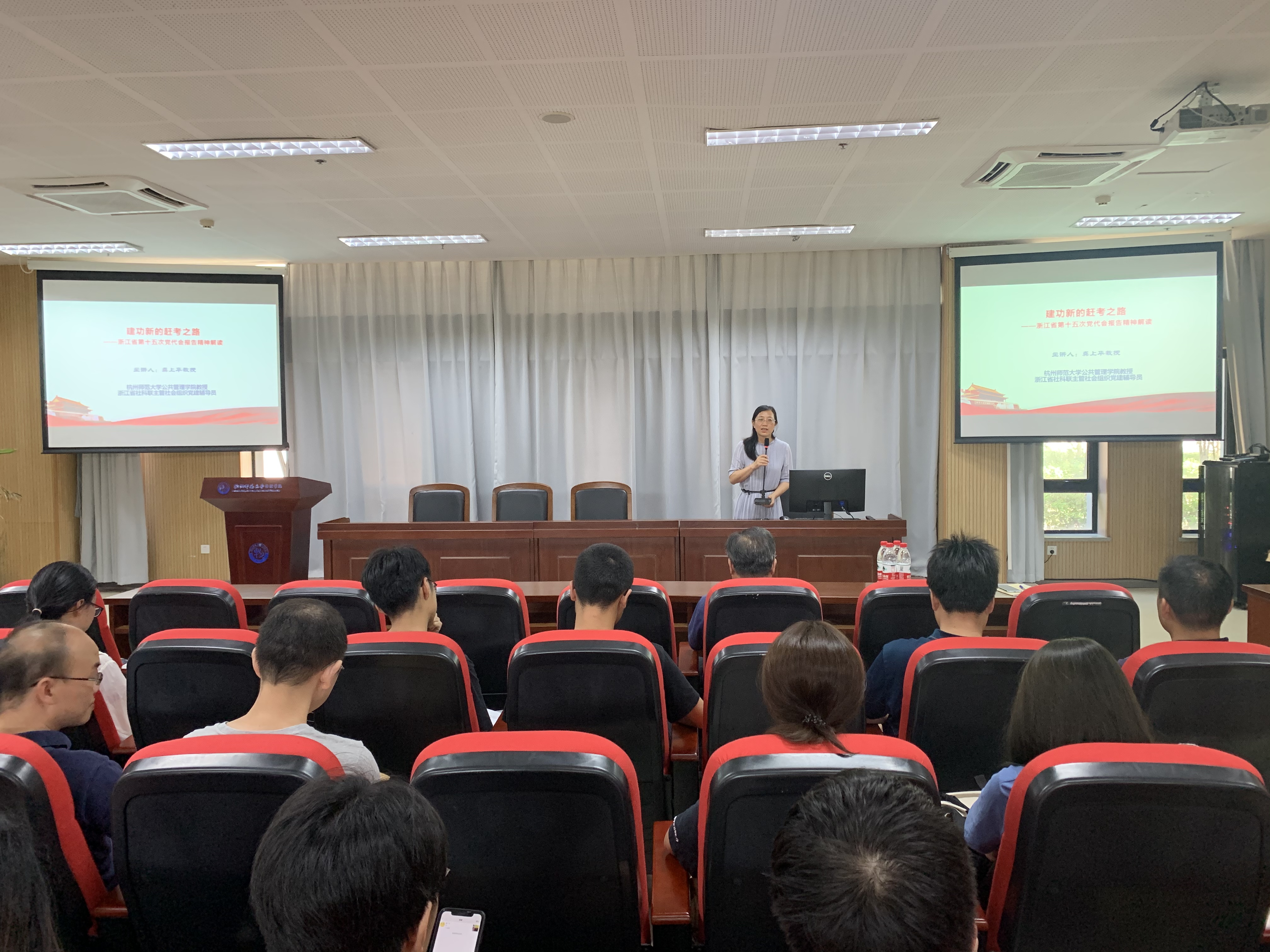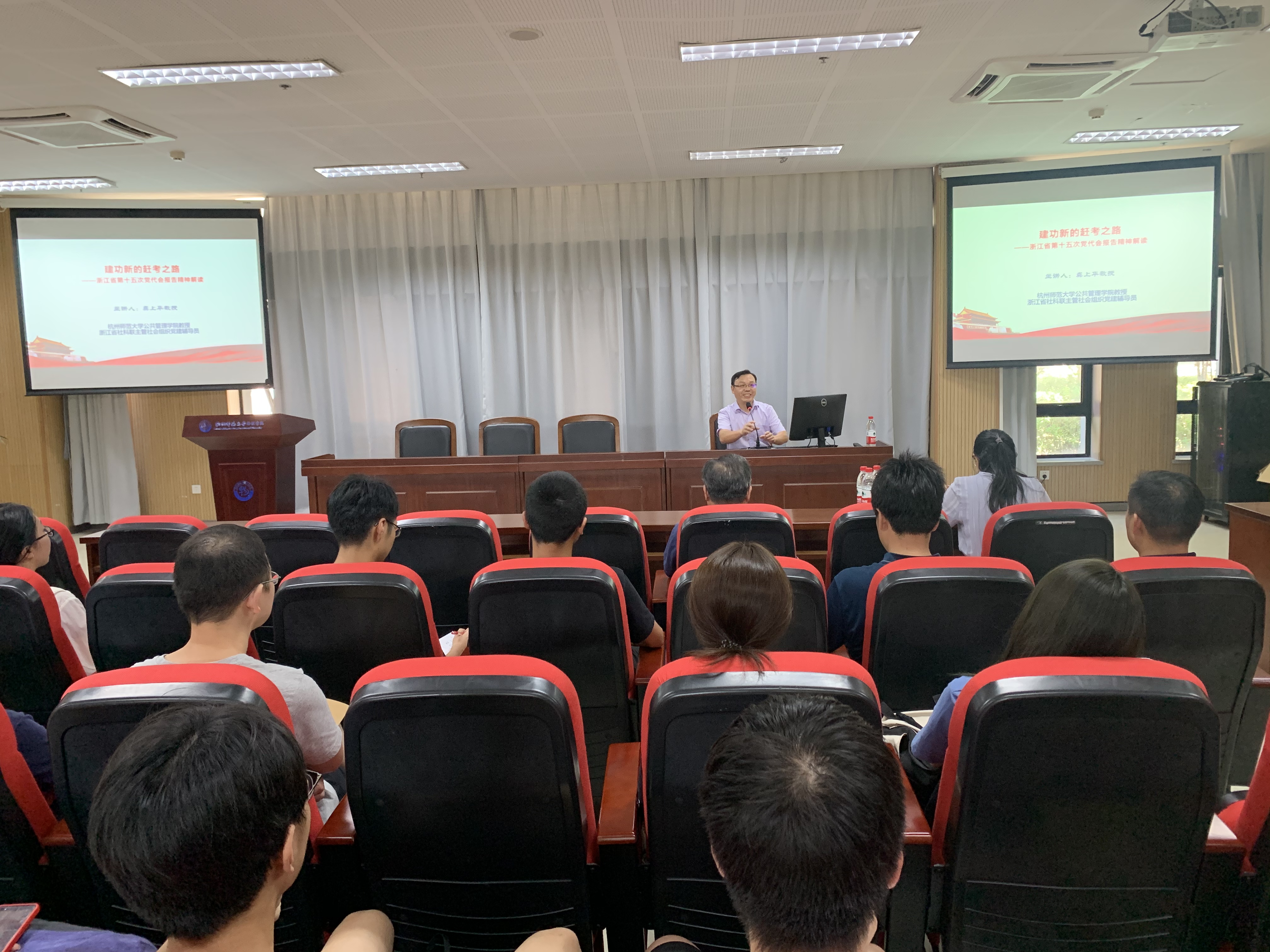 首先,浙江省社科联主管社团党建辅导员、黄色电影 公共管理学院副院长龚上华教授以《建功新的赶考之路——浙江省第十五次党代会报告精神解读》为题,作了一次深刻的辅导报告。报告结合浙江省情与新世纪党代会省域定位,在回顾过去五年赶考成就的基础上,解码过去5年成功的“浙江密码”;更是以“28510”数字化、形象化地解读了未来五年的目标……始终紧扣“两个维护”、“两个大局”、“两个先行”三个关键词,指出唯有坚定不移沿着总书记指引的方向奋勇前进,才能闯出新路、不负使命。