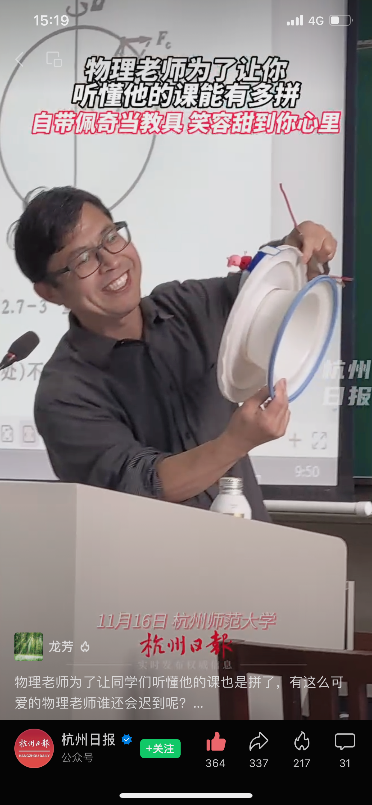虽然很多老师、同学都为朱老师钻研教学的精神点赞,但是他却说这是很普通正常的事情,让学生愿意听、听得懂、学得会是每位老师分内职责,视频被学生传到网上还是很意外。他笑称,自媒体时代会发生各种想不到的事,看来同学们更喜欢佩奇,不论老师还是佩奇,带“货”能把物理带出去就是好事。