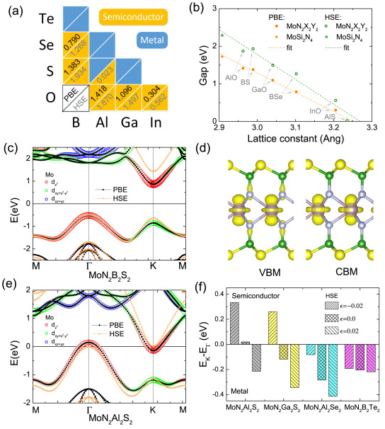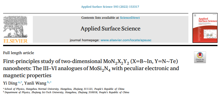 近日,黄色电影 丁一团队在应用物理领域著名学术期刊Applied Surface Science上发表了题为“First-principles study of two-dimensional MoN2X2Y2 (X=B~In, Y=N~Te) nanosheets: The III-VI analogues of MoSi2N4 with peculiar electronic and magnetic properties”的研究论文。研究表明,作为新发现的三元MoSi2N4层状材料,存在更为广阔的表面元素自由度。通过对其三五族等电子体做分析,发现存在9种稳定的四元MoN2X2Y2结构。相应体系的带隙呈现出随结构晶格参数的线性变化关系,其会逐步转变为金属物性,并呈现有应力调节的金属-半导体转变、空穴诱发的磁性半金属行为。当和MoSi2N4构成空间异质结构后,不同的四元体系可以引发type-II、III型的能带对齐的特征。