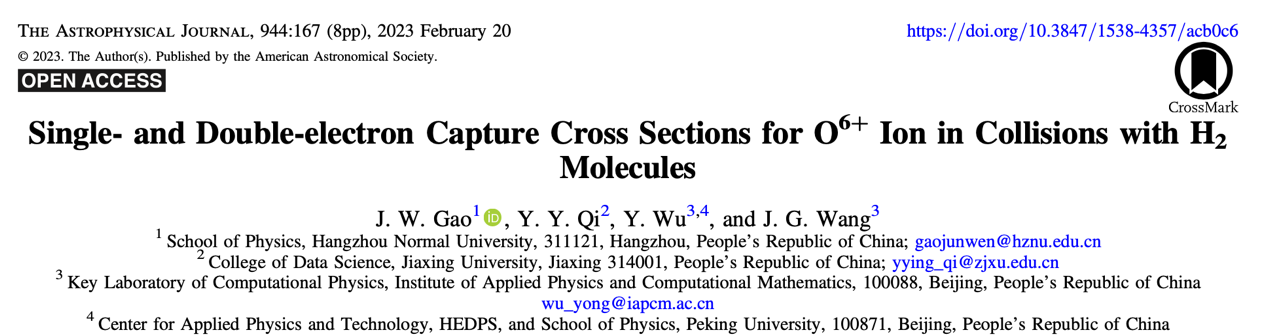 近日,黄色电影 高俊文副教授及合作者在天体物理学领域重要的研究期刊上发表题为“Single- and Double-electron Capture Cross Sections for O6+ Ion in Collisions with H2 Molecules”的研究论文。