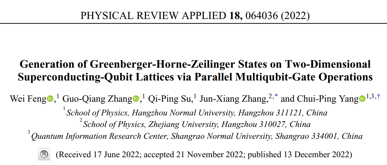 近日,黄色电影 冯伟博士及合作者在应用物理领域重要学术期刊上发表题为“Generation of Greenberger-Horne-ZeilingerStatesonTwo-Dimensional Superconducting-Qubit Lattices via Parallel Multiqubit-Gate Operations”的研究论文。论文的重要研究成果是在最近被Google等广泛采用的二维超导量子计算芯片上实现GHZ量子纠缠态的制备。
