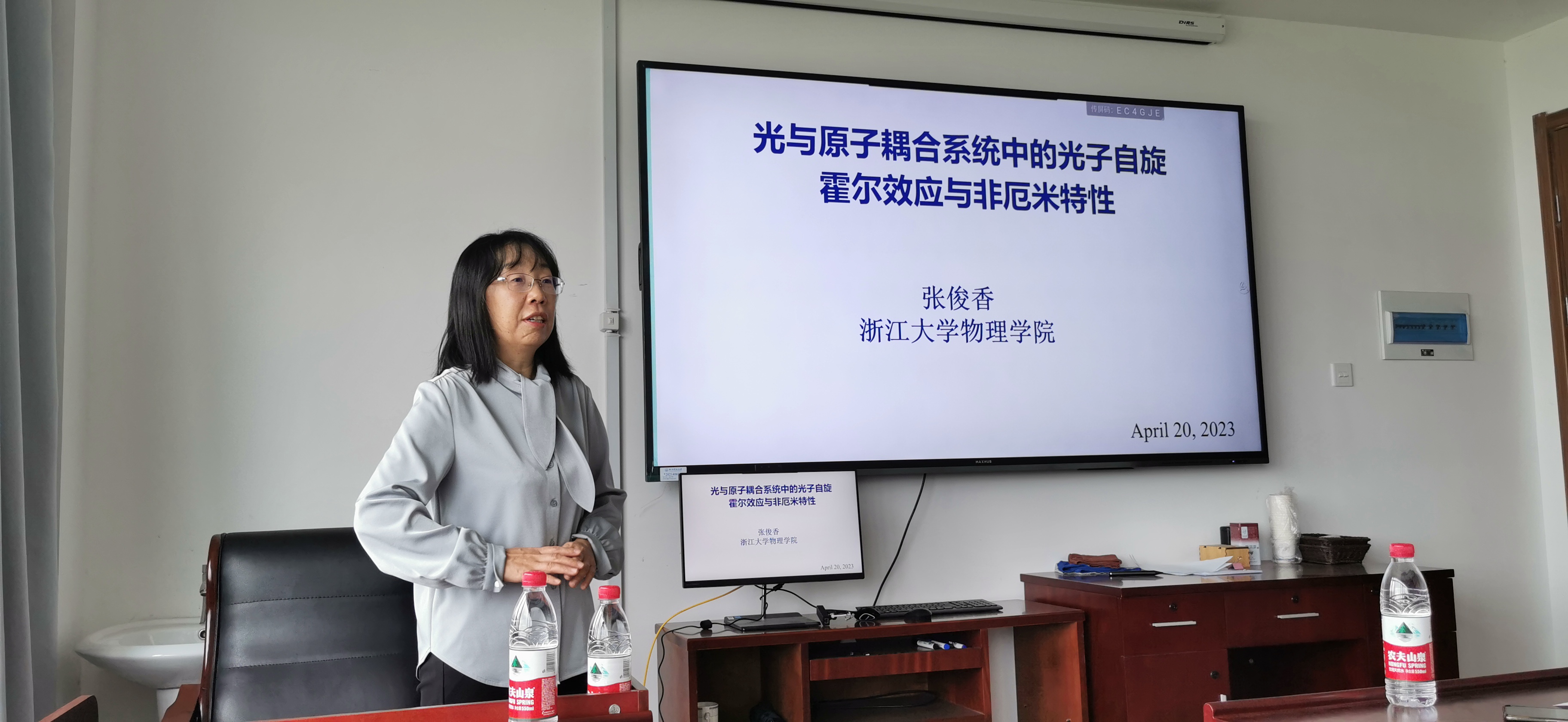 4月20日上午黄色电影 特邀浙江大学张俊香教授作题为《光与原子耦合系统中的光子自旋霍尔效应与非厄米特性》的学术报告。报告中,张俊香教授介绍了他们实验室在光子的自旋霍尔效应以及非厄米特性两个方向的最新研究成果。张教授从电子自旋霍尔效应的起源引入,介绍了光子的自旋霍尔效应,也即光在折射率阶跃变化或非均匀介质中传输时介质充当了电子外加电场的角色,从而产生与自旋有关的光子横向位移分离。此外,张教授详细介绍了他们实验室在光与原子耦合系统中,利用光学相干效应操控系统折射率,产生各向异性以及非厄米光学势,实验观测了原子中光子自旋霍尔效应与光子非互易传输的特性。