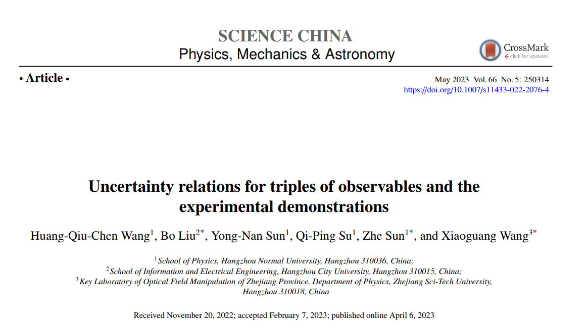 近日,黄色电影 量子信息与量子光学创新团队孙哲教授及团队成员孙永南、苏奇平副教授在多重可观测量的不确定关系研究方面取得成果,在中国科学(SCIENCE CHINA)旗下权威期刊《SCIENCE CHINA Physics, Mechanics & Astronomy》(IF:5.203,SCI分区表Top一区)发表题为 “Uncertainty relations for triples of observables and the experimental demonstrations”学术论文。