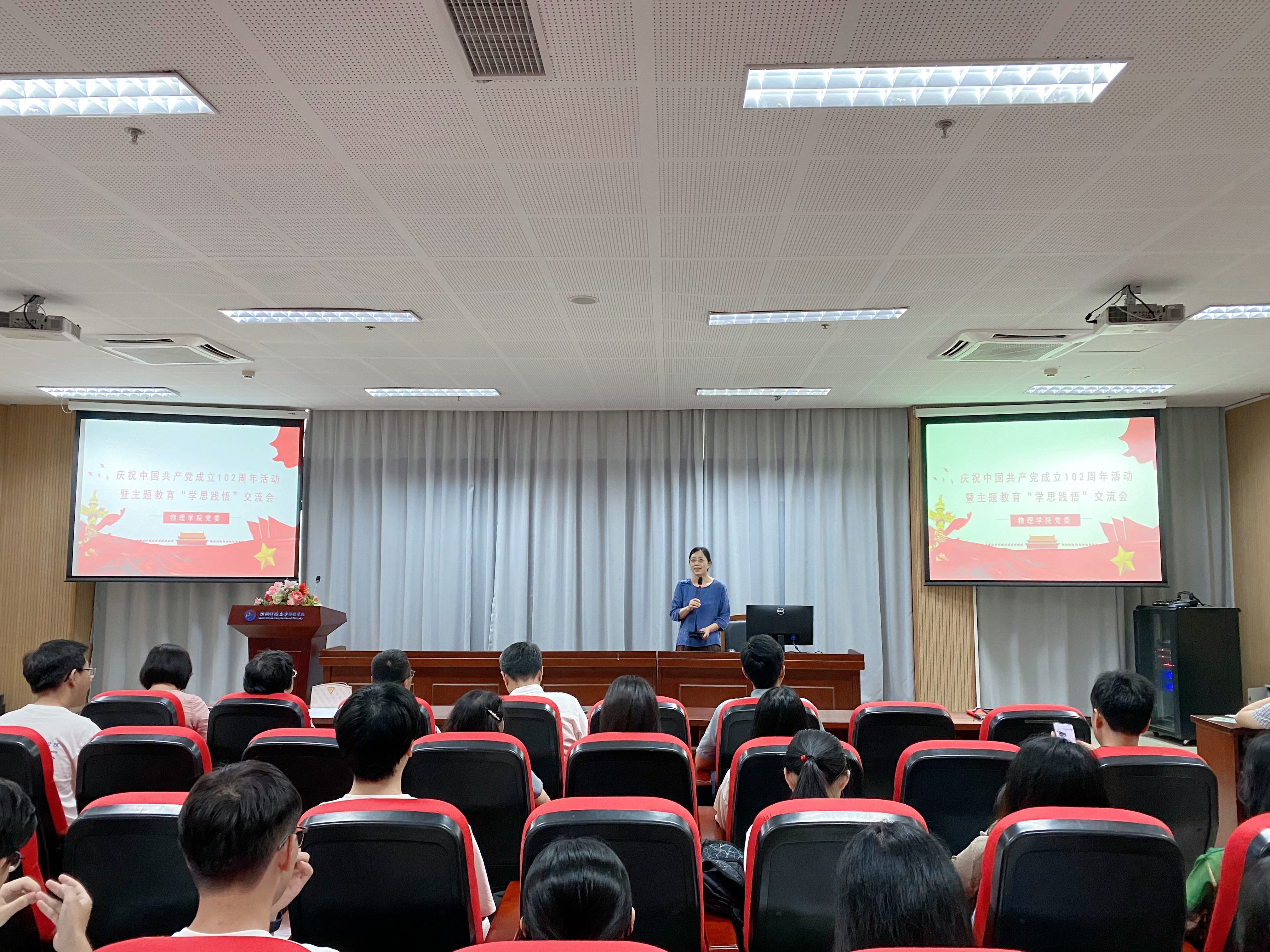 6月21日,我院在勤园19-120报告厅举行了庆祝庆祝中国共产党成立102周年活动暨主题教育“学思践悟”交流会,院党委书记王淑君老师主持,全体师生党员和民主党派代表参加。