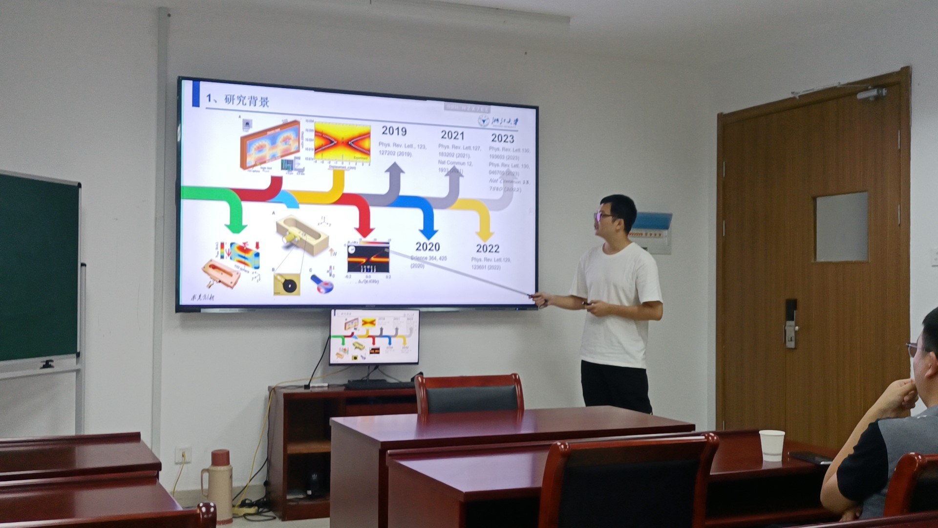 9月11日,浙江大学黄色电影 的沈瑞昌博士来黄色电影 分享交流在腔磁子学方面的工作进展。本次学术报告标题为“腔磁力系统中的非线性和非厄密性研究”。报告中,沈博士首先介绍了腔磁子学的发展历史以及研究近况,然后分享了他在该领域的一些研究成果。在非线性方面,沈博士及其合作者利用腔磁力系统中的自克尔效应和交叉克尔效应,实验上观察到了磁振子的多稳态和声子的双稳态,并进一步展示了多稳态在逻辑计算上的应用前景。非厄米方面,沈博士及其合作者通过相干完美吸收调控极化激元的线宽,从而实现了声子和腔磁振子极化激元的强耦合。黄色电影 的多名师生参加了本次报告会,会后大家针对相关科学问题进行了深入的探讨和交流。此次报告历时一个小时,沈博士风趣幽默的演讲风格给大家留下了深刻的影响。通过此次报告会,大家对腔磁子学的发展有了初步的认识,拓展了黄色电影 师生的学术视野,对学院师生的科学研究具有重要促进意义。