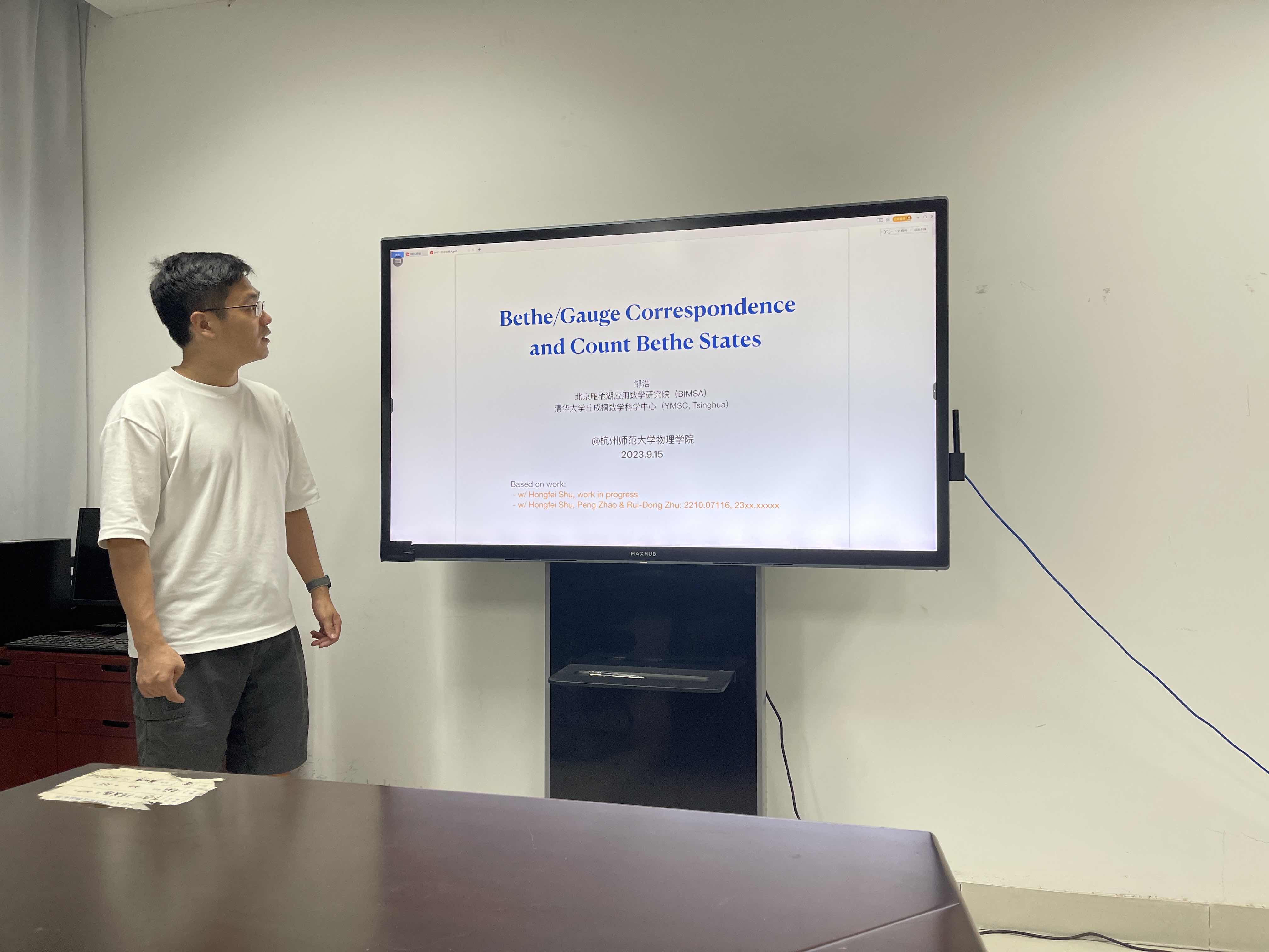 9月15日下午,北京雁栖湖应用数学研究院和清华大学丘成桐数学科学中心的邹浩士博士应邀来黄色电影 ,为院内师生带来了一场精彩的学术报告。报告的题目是《Bethe/Gauge Correspondence and Count Bethe States》,主要介绍了可积系统里Bethe States的数态问题,Bethe/Gauge Correspondence的对应关系,以及如何把Bethe/Gauge Correspondence应用到超对称规范场论里解决数态问题。