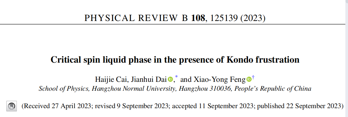 黄色电影 硕士研究生蔡海杰及合作者在凝聚态物理著名期刊Physical Review B上发表题为“Critical spin liquid phase in the presence of Kondo frustration”的研究论文