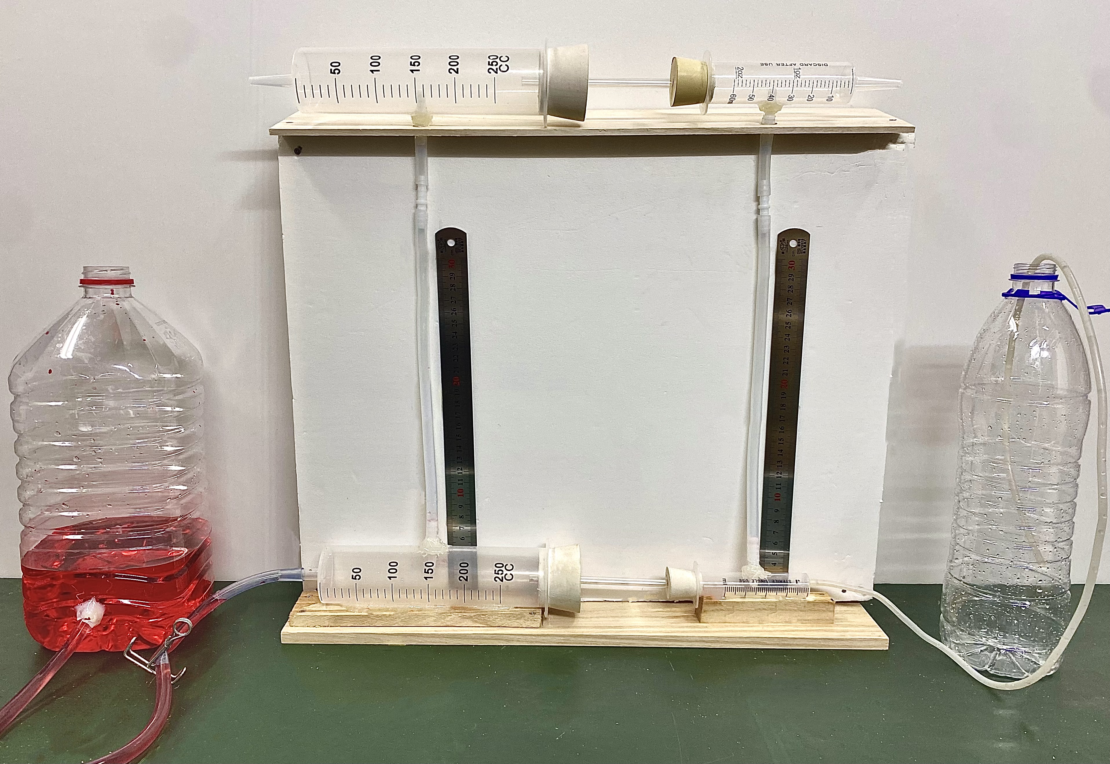 伯努利原理说明流体压强与流速之间的关系为“流速越大,压强越小”。液体和气体都属于流体,当同一流体通过一段横截面积不同的路径时,横截面大的流速小,压强大,横截面小的流速大,压强小,两者之间存在压强差。本教具基于此,利用管内液面变化来反映对应部位压强变化,分别探究液体和气体压强与流速的关系,得出流体压强与流速关系的普遍规律。