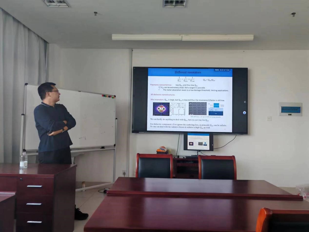 讲座中,韩张华教授首先阐述了若干常见的人工微纳光学谐振结构,随后提出了一个问题:为何我们需要谐振腔?答案在于,更高的本地光场强度有助于提升光学非线性效应的效率。接着,韩教授分享了其近年来的研究重点:基于超表面的非局域谐振结构,以及连续体束缚态和准连续体束缚态的概念。他展示了准连续体准束缚态的应用,如增强型频率上转换和窄带宽高空间相干性的太赫兹热光源。超表面光学近年来成为国际研究热点,因此现场师生积极提问,整个环节持续近一个小时。韩教授对我校师生求知若渴的精神给予了高度评价。
