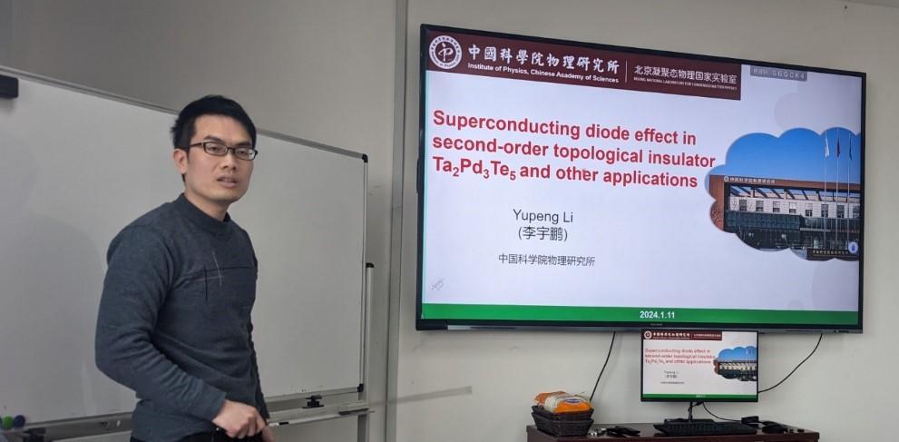 2024年1月11日下午,黄色电影 物理研究所的李宇鹏博士应邀来黄色电影 作题为“二阶拓扑绝缘体Ta2Pd3Te5的超导二极管效应及其他应用研究”的学术报告。李宇鹏博士主要从事拓扑和超导材料的物性探索以及其在二维器件中的非常规输运研究。