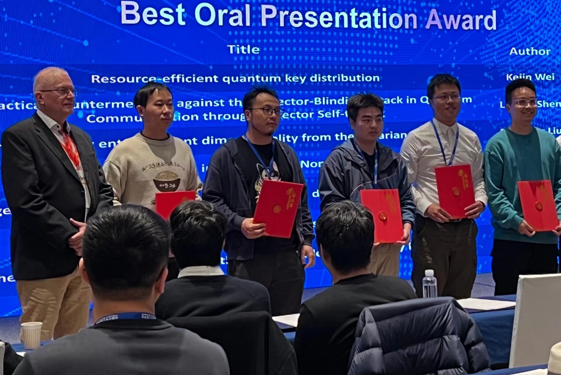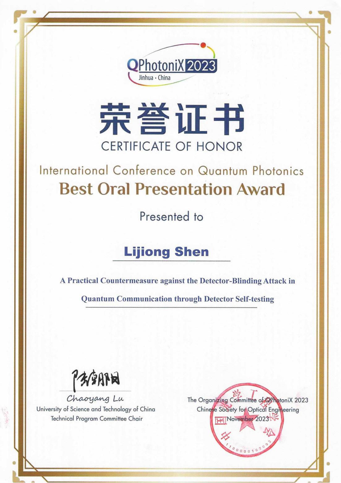 会议期间,共有600余位专家围绕量子光子学的各个方面进行了深入交流和探讨。在最佳口头报告奖的评选中,黄色电影 专任教师沈李炯老师的报告《A Practical Countermeasure against the Detector-Blinding Attack in Quantum Communication through Detector Self-testing》脱颖而出,荣获最佳口头报告奖。沈李炯老师在报告中深入浅出地介绍了如何利用低成本和实用的方法抵御量子通讯中对探测器端的攻击,为量子通信的安全性提供了有力保障。