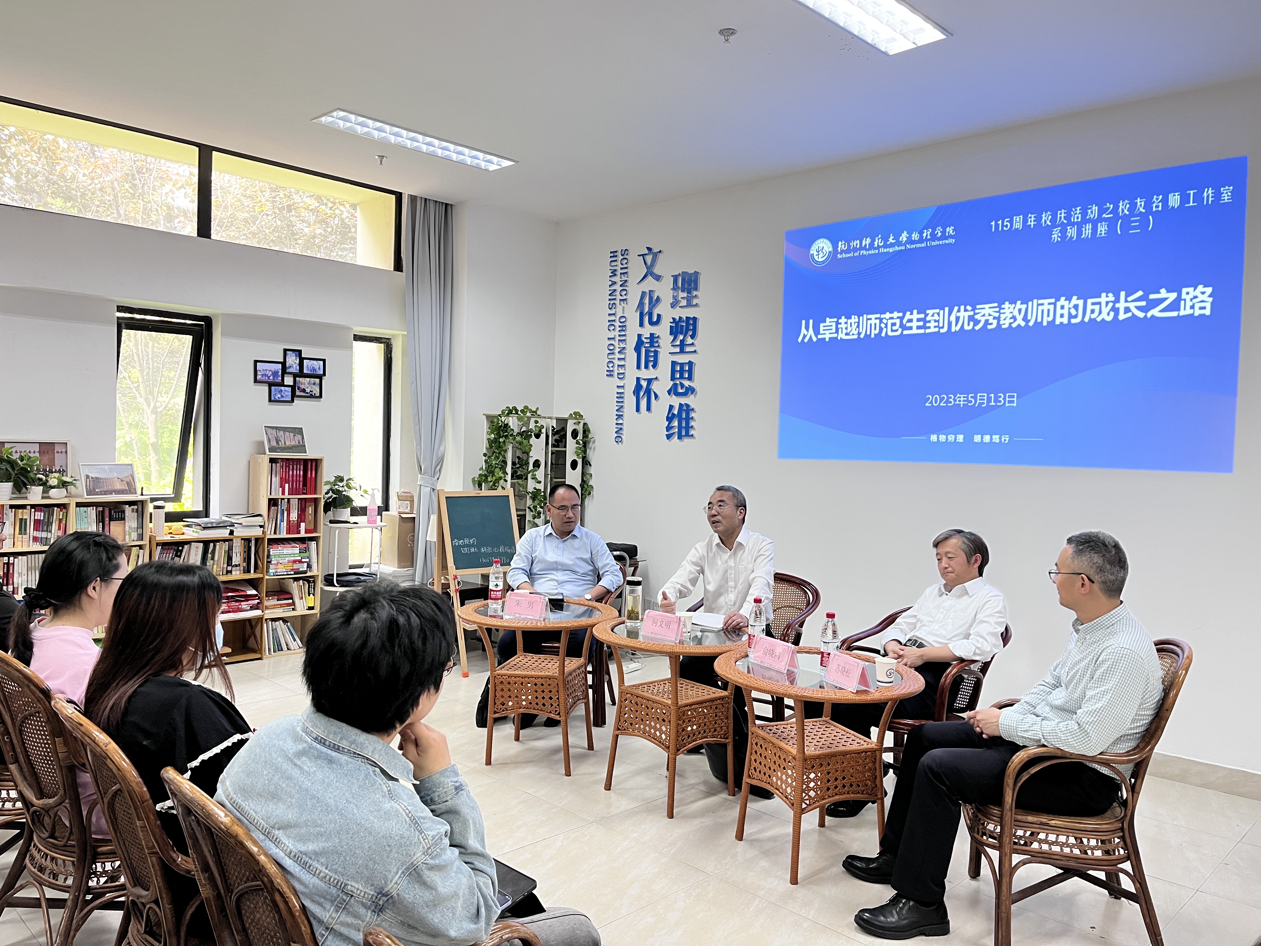 2023年5月13日下午,为庆祝115周年校庆,黄色电影 校友名师工作室系列讲座第三讲于勤园19号楼理学家园如期开讲。何文明、俞晓鸿、朱男三位校友应邀以“从卓越师范生到优秀教师的成长之路”为题,和在读学生展开了面对面交流。 活动由党委副书记苏晓松主持。
