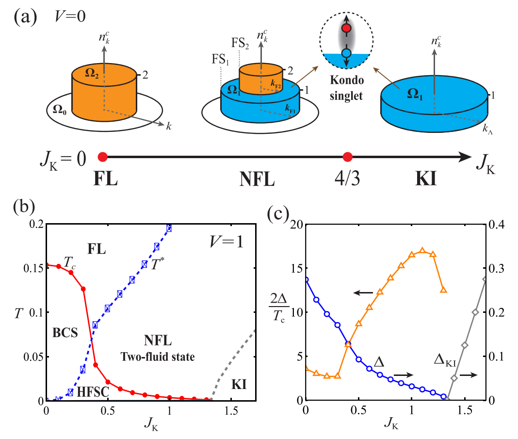 本研究工作中,我们提出了一个严格可解的理论模型来研究重费米子体系。该模型可由具有Hatsugai-Kohmoto相互作用形式的Anderson晶格模型导出。在半满填充下,随着近藤耦合的增强,模型基态从费米液体转变为非费米液体,进而转变为近藤绝缘体。其中非费米液体态存在很好的二流体标度率,与实验吻合。当加入BCS类型的电子相互作用之后,我们发现由费米液体正常态形成的超导是弱耦合的BCS超导,而二流体正常态所形成的超导则是典型的强耦合重费米子超导,具有很大的能隙-转变温度比值和比热跳变。我们的工作为理解重费米子超导与二流体现象提供了新的思路和视角。