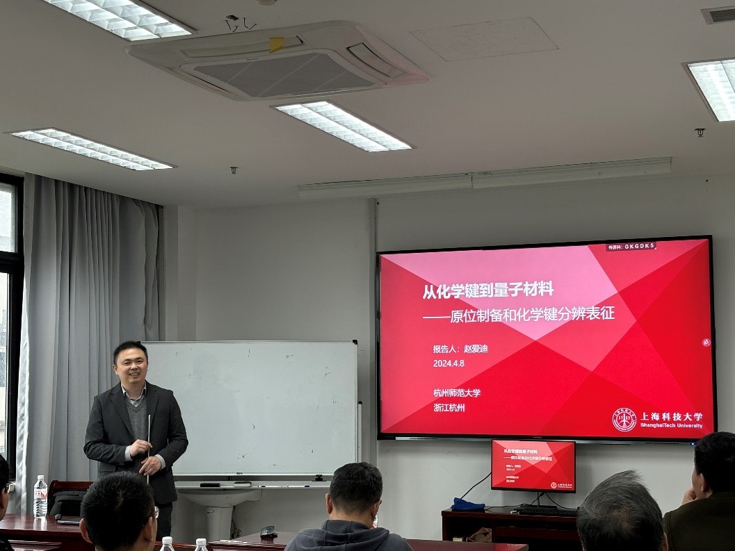 4月8日下午,学院邀请了上海科技大学赵爱迪教授做主题为“从化学键到低维量子材料”的报告。赵教授长期从事单分子科学、高分辨扫描探针显微学、低维量子材料原位制备等领域的研究,在Science、Nature Materials等SCI杂志上发表学术论文70余篇,研究成果曾入选中国十大科技进展。
