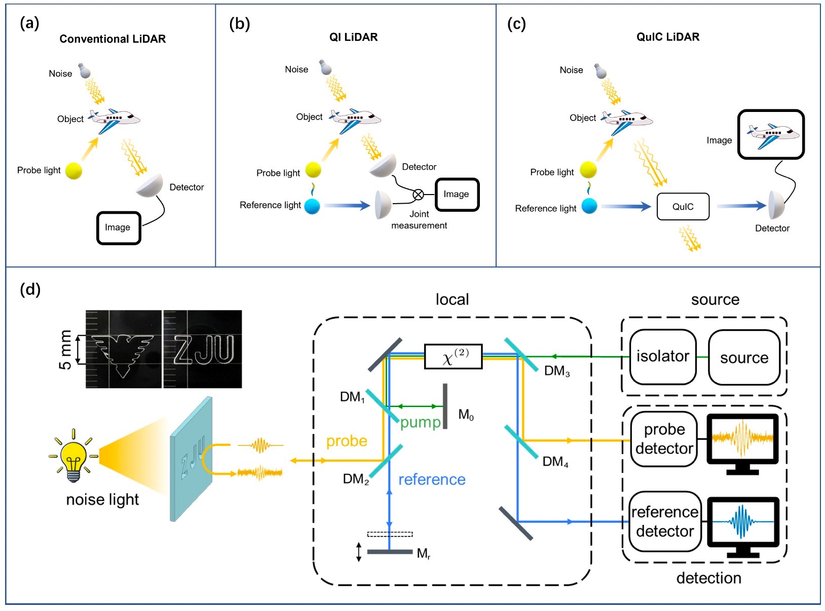 量子照明可以提高光雷达的信噪比。目前量子照明雷达主要依赖于关联探测,其分辨率会受到探测器响应时间的限制,并容易遭受环境噪声的干扰。基于量子纠缠光源并利用量子擦除的原理,我们设计并验证了一种量子诱导相干光雷达(QuIC LiDAR),可以实现高环境噪声下的精准测距和成像。在传统光雷达中,从物体上反射回来的探测光直接进入探测器,其雷达探测信噪比随背景噪声的增加而下降。在量子诱导相干光雷达中,我们先产生两束互相纠缠的光,使用其中一束探测物体,而将另一束保留在本地作为参考光并搭建干涉仪。反射回来的探测光不被直接探测,而是用于擦除参考光的路径信息,使其干涉条纹得以显现。通过扫描参考光的光程,我们可以获取物体的距离和图像信息。在这一过程中,伴随探测光的环境光没有进入探测器,对光雷达没有影响。我们用LED和激光模拟背景噪声和饱和攻击,展示了量子诱导相干光雷达的抗噪性。