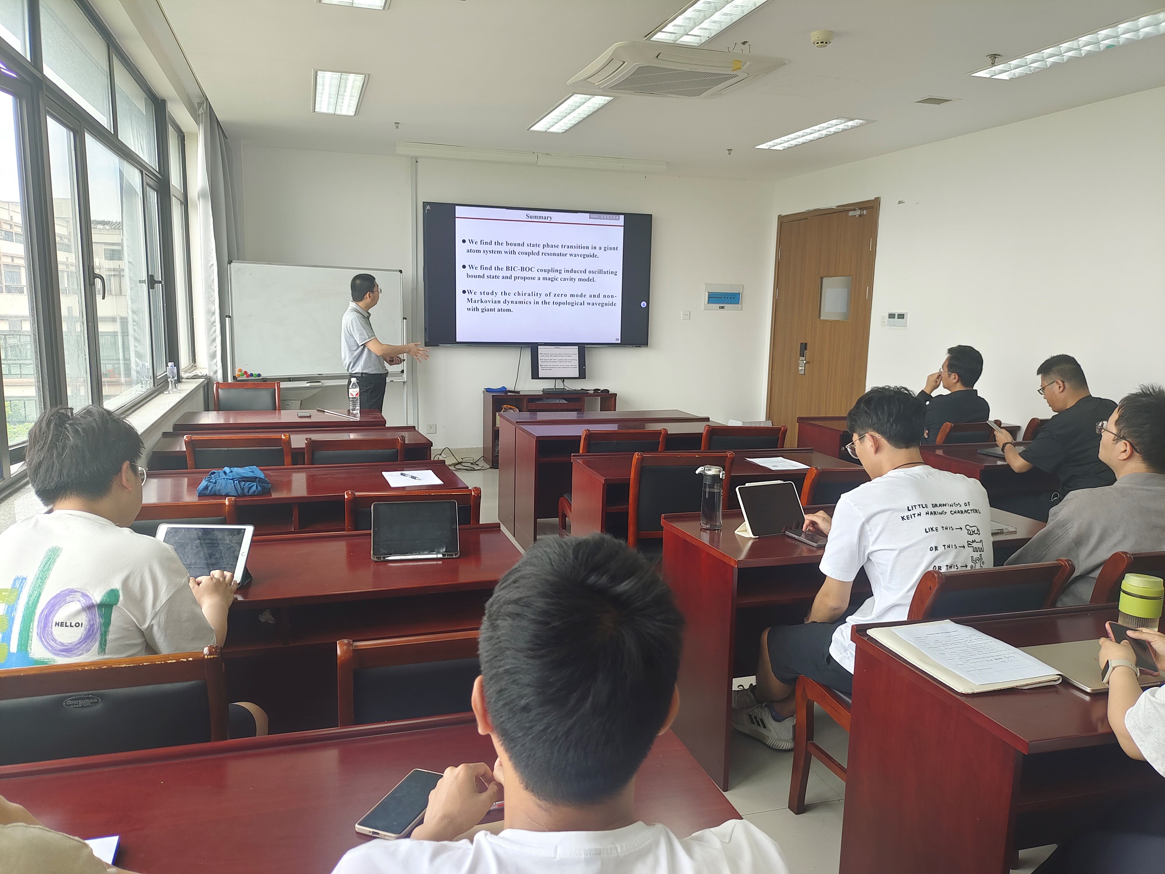 王治海教授首先为大家深入浅出地介绍了报告的背景知识。他运用生动形象的例子,解释了巨原子、magic cavity以及手性等复杂概念,使在场的师生们对这些前沿物理概念有了初步的认识和了解。紧接着,王教授详细阐述了其近期在巨原子波导电动力学系统研究中的一系列重要成果。他重点分享了具有耦合谐振腔波导的巨原子系统中束缚态相变的研究进展,以及BIC-BOC耦合诱导的振荡束缚态现象。此外,王教授还提出了一个独特的幻腔模型,引发了与会人员的浓厚兴趣和热烈讨论。在报告的后半部分,王教授进一步探讨了含巨原子拓扑波导中零模和非马尔可夫动力学的手性特性,并指出了当前研究中存在的挑战以及未来的研究方向。他的独到见解和深刻分析,为黄色电影 师生提供了新的研究思路和方向。