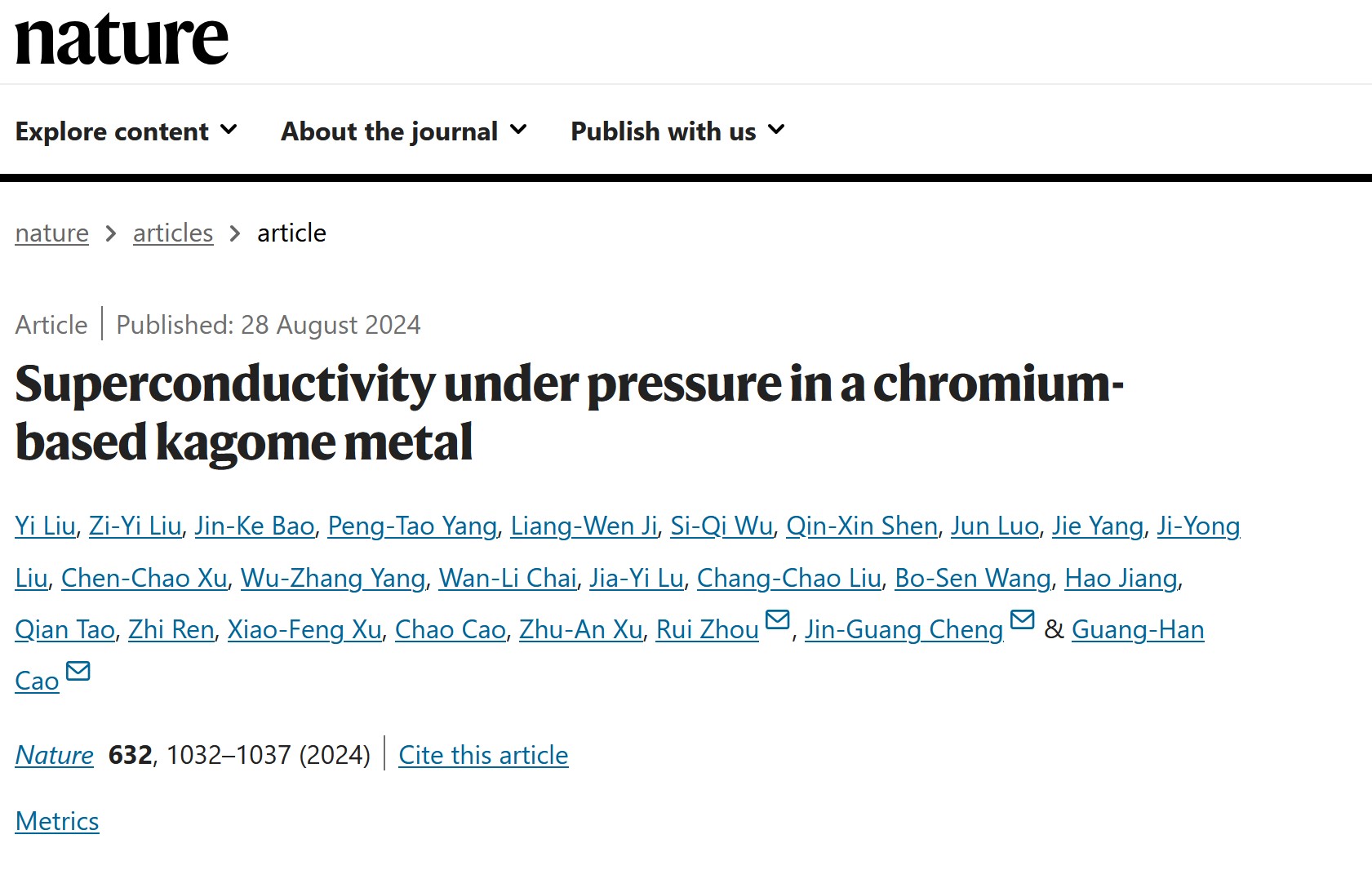 相关成果以题为“Superconductivity under pressure in a chromium-based kagome metal”发表于综合类顶级期刊Nature。