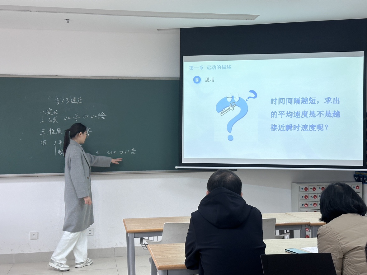 第二位选手牛佳洁同学选择的讲课主题是“速度”。她以谢震业破百米纪录为切入点,通过对比初高中有关速度的学习,引出矢量、平均速度、瞬时速度等新概念,板书清晰,叙述流畅。