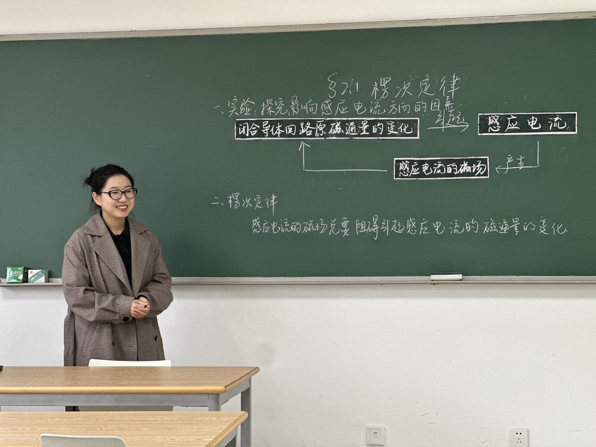 第三位选手是毛俊驰同学,她选择的章节是“楞次定律”。毛俊驰同学从“小魔术”出发,引起学生们对现象的思考,随后通过深入浅出的讲解,将物理定律拆分开、多方位地阐述,教态自然大方,环节完整。