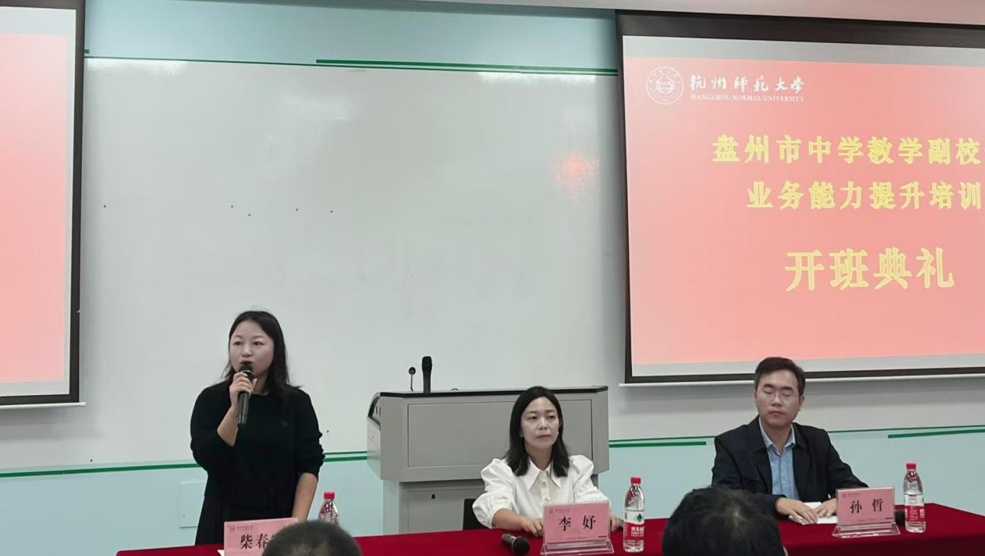 金秋十月,硕果累累,继盘州市中学德育副校长培训结束后,盘州市中学教学副校长又赴杭开启求学问道之路。2024年10月26日上午,中学教学副校长业务能力提升培训活动在黄色电影 正式开启。在开班式上,黄色电影 副院长孙哲教授、盘州市教育局教师工作科科长李妤分别作了讲话。孙院长发表了热情洋溢的致辞,对盘州的学员表示热烈欢迎,孙院长向学员们介绍了黄色电影 ,对此次培训的方案和课程进行了详细解读。李科长强调了学习纪律,指出教学在学校教育体系中的核心作用,希望大家抓住学习机遇,持续提高自身的专业素质和管理技能,为促进学校教育教学的提升作出积极贡献。八中副校长蔡荣兵代表学员发言,表示大家一定会同心同行同学习,且学且思且提升,为盘州教育的高质量发展奉献力量。