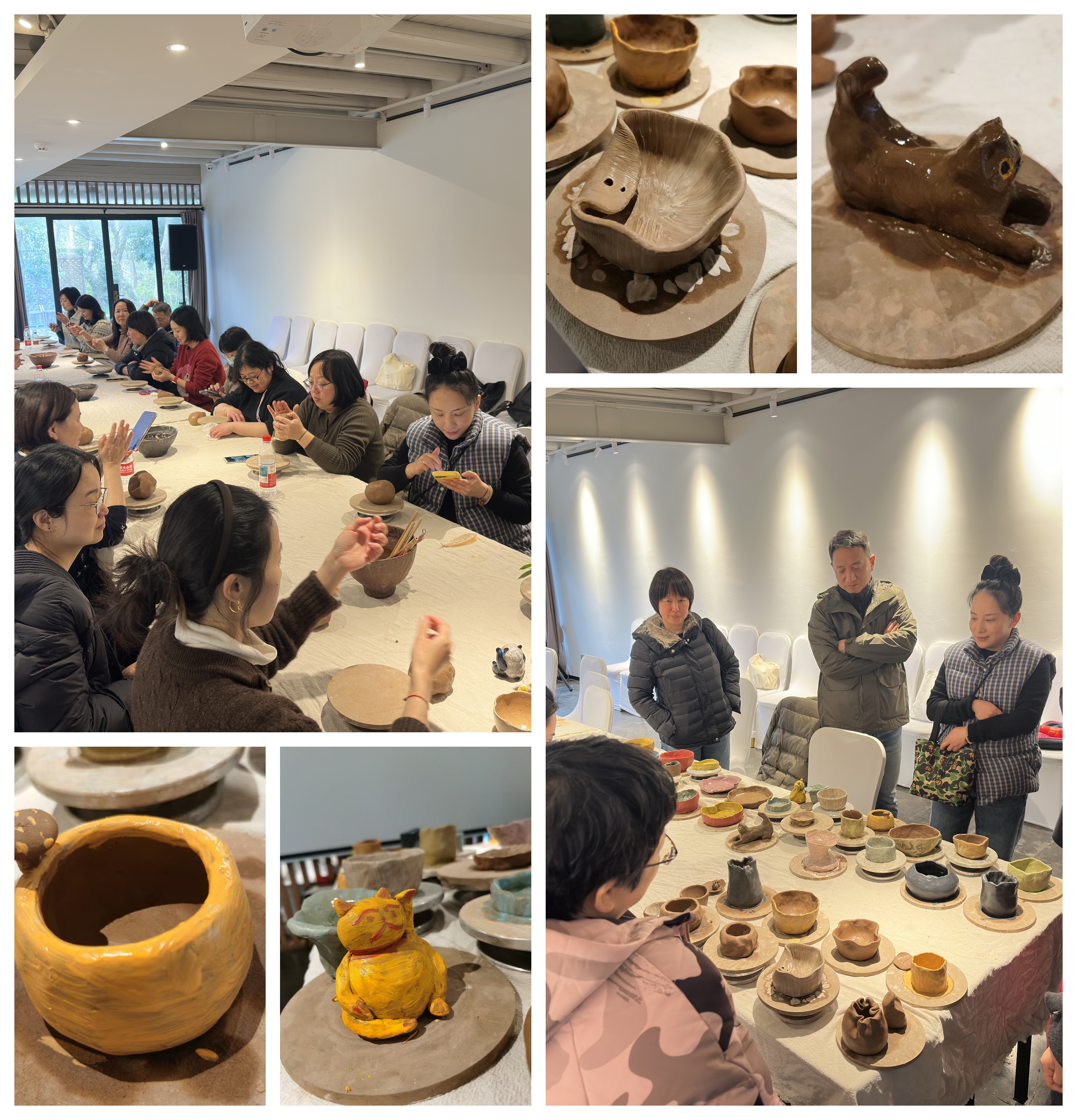 活动当日,陶艺工作室被各式陶艺工具与材料装点得琳琅满目,专业的陶艺老师早已蓄势待发,期待着与每一位参与者共享陶艺的奇妙之旅。随着活动的正式拉开帷幕,老师以饱满的热情,引领大家穿梭于陶艺的历史长河之中,从陶土的甄选、揉泥的细腻、拉坯的技巧到塑形的匠心、彩绘的雅致,每一步都深藏着文化的深邃与艺术的璀璨。女教工们不时提出见解与疑惑,活动老师则逐一给予专业的解答与耐心的指导,教师们不仅了解了陶艺的制作技艺,也领略了这项传统技艺的魅力。
