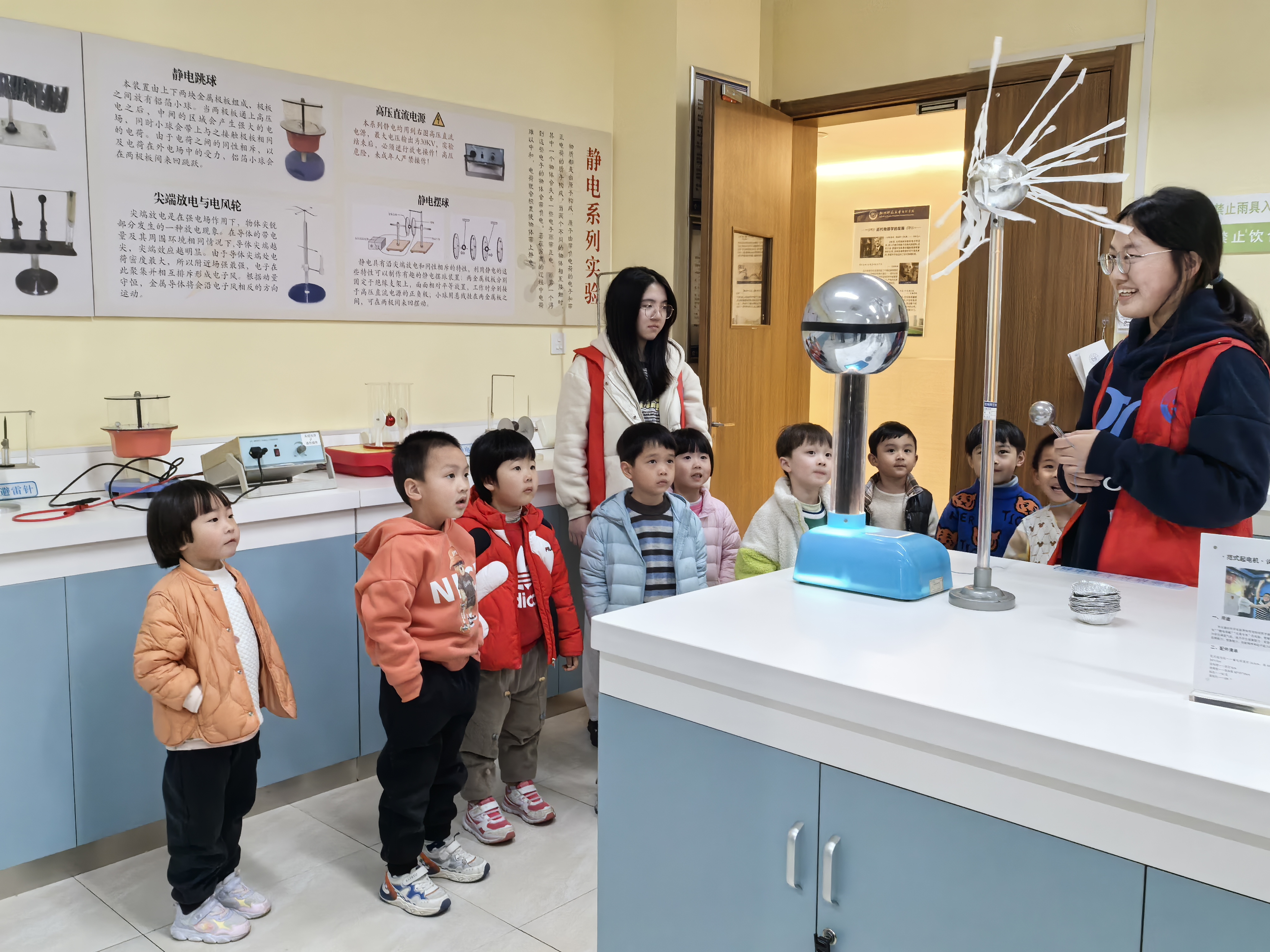 三月杭城,春意正浓。在这充满生机的季节里,一场别开生面的科学启蒙之旅在黄色电影 物理演示实验室拉开帷幕。近日,学院接待了杭师大幼儿园的集体参观活动,党员教师和学院科普志愿者带领孩子们沉浸式体验科学魅力,激发幼儿科学探索兴趣,培养观察与思考能力。此次活动孩子们参观了涵盖力学、热学、声学、光学和电学五大主题的三个演示实验室。长达一小时的互动体验与趣味演示,为小朋友们揭开了物理世界的神秘面纱。