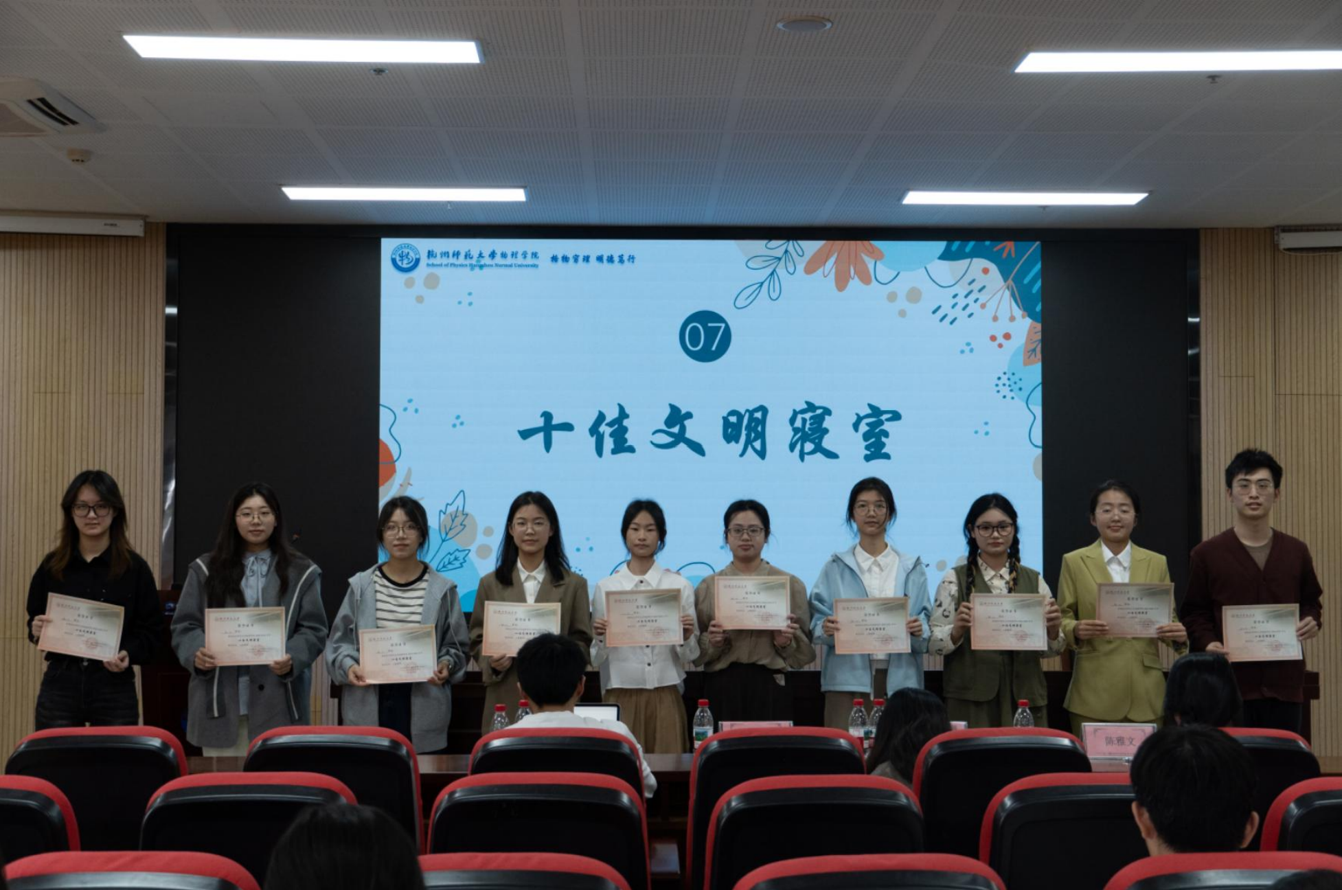 最后,大会公布了经评委评分后评选出的十个十佳文明寝室,为获奖寝室颁发奖状并为各优秀寝室发放奖品。