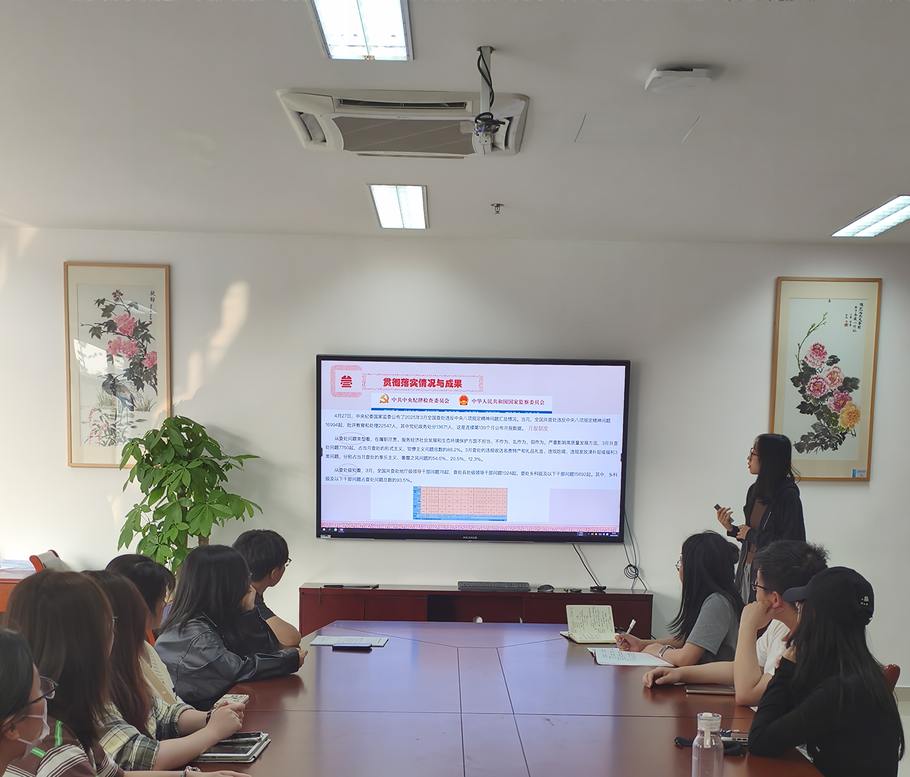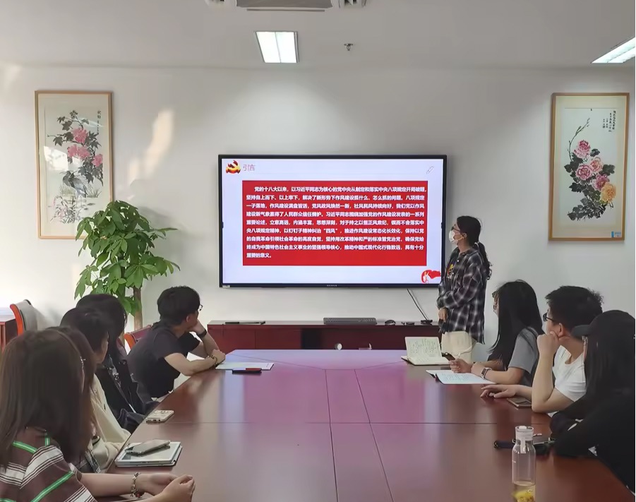 周彦希同学就“中央八项规定精神”的出台背景、基本内容、落实情况进行了学习分享,并结合生动的视频,带领党员们回顾了中央八项规定从颁布到落实多年发生的重大转变。党员们通过视频了解了规定颁布前的诸多乱象,由此感受到中国共产党刀刃向内、主动强化监督执纪的重大决心和恒心,也切实体会到这一规定落实后的重大成果和深远意义。