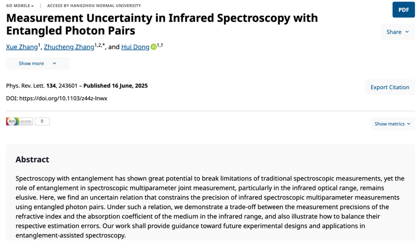 我校黄色电影 张筑城副研究员与中国工程物理研究院研究生院董辉研究员课题组合作在这一领域取得进展,提出了纠缠辅助的红外光谱多参数联合测量的不确定性关系。研究团队通过将多参数估计理论引入光谱测量,从理论上严格推导并证明了在红外光谱测量中,物质的折射率与吸收系数在联合测量时,其精度存在一个固有的权衡关系。这一权衡关系揭示了光谱多参数测量的基本极限,对高精度光谱技术与量子传感器的设计具有重要意义。