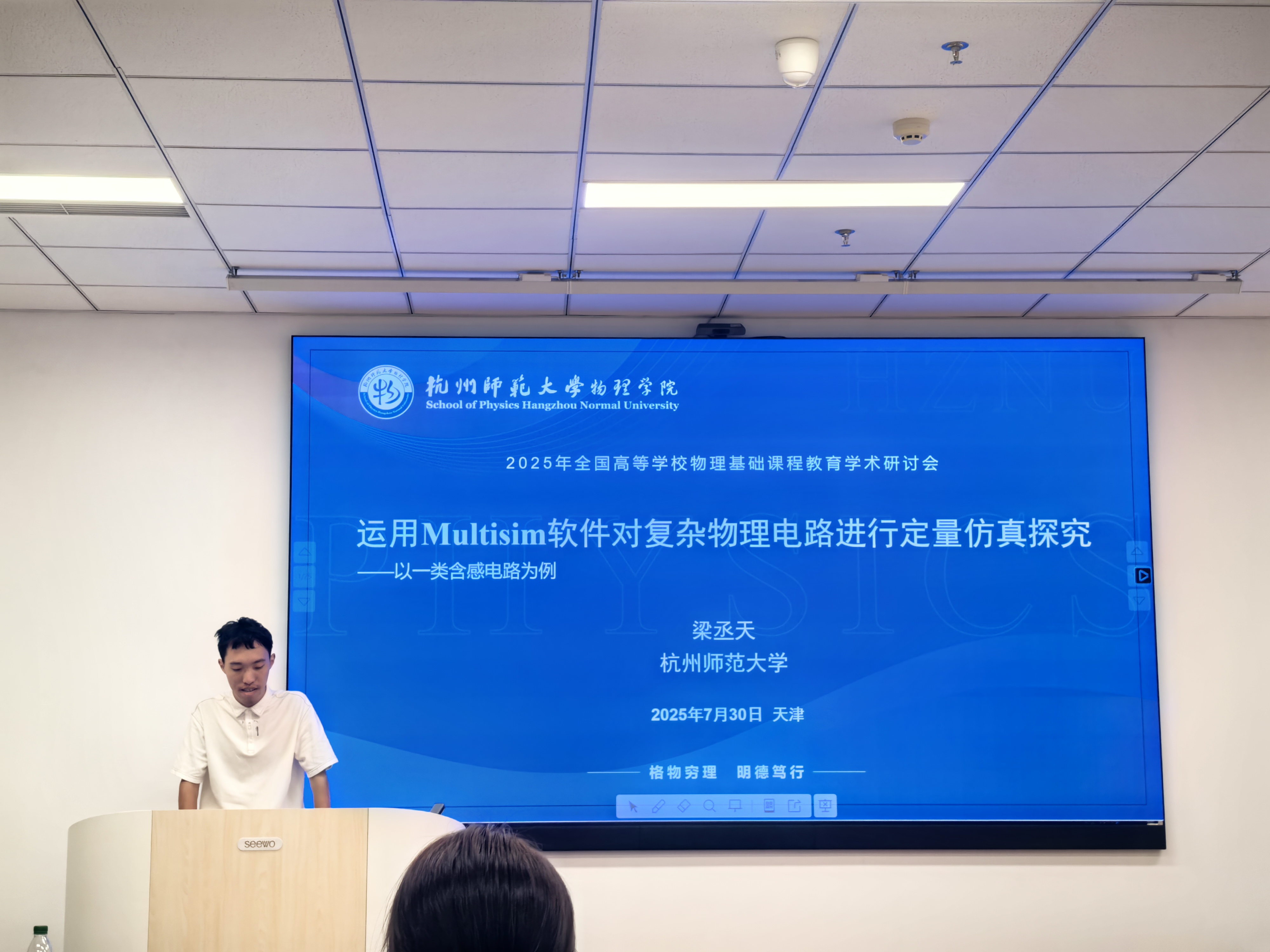 本次研讨会以“数承物理,智启未来”为主题,来自全国26个省市自治区的186所高校、13家企业共380余名代表参加了此次会议。研讨会上,物理复合231班梁丞天代表团队基于录用在《物理与工程》(2025年全国高等学校物理基础课程教育学术研讨会论文集)的《运用Multisim软件对一类电感电路问题定量仿真探究》论文,从研究背景、理论分析、仿真模拟等方面结合研究体悟,作题为《运用Multisim软件对复杂物理电路进行定量仿真探究——以一类含感电路为例》报告并获得参会师生的一致肯定与好评。