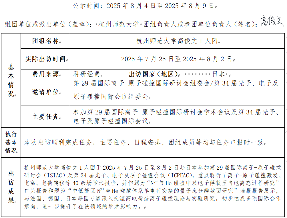 在此次赴日本参加第 29 届国际离子-原子碰撞国际研讨会(ISIAC)和第 34 届光子、电子及原子碰撞国际会议(ICPEAC)期间,我主要完成了以下几方面工作:首先,在京都参加ISIAC期间,深入听取了国际同行关于离子-原子碰撞激发、电离、电荷转移及离子与表面、分子和团簇相互作用等方向的最新研究报告,并重点围绕高电荷态离子双电子俘获、自电离过程及角微分截面理论研究与实验测量等前沿问题,与法国Nicolas Sisourat教授、Alain Dubois教授等专家展开了深入学术讨论。其次,我作了题为“N⁷⁺与He碰撞中双电子俘获至自电离态过程研究”的口头报告,系统介绍了课题组最新理论方法与计算结果,并就多电子关联效应和实验对比方面与与会专家进行了详细的讨论,得到了积极评价。