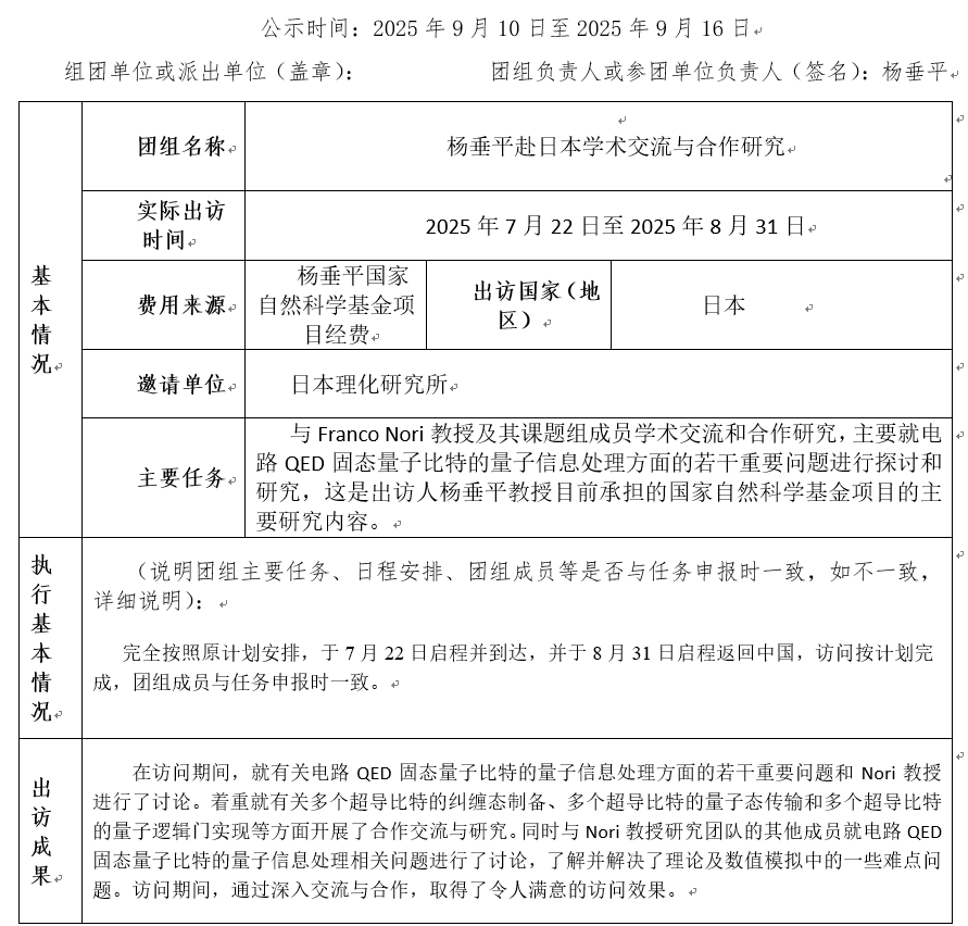 受日本理化研究所Franco Nori教授的邀请,于2025年7月22号至2025年8月31号访问了Nori教授的研究课题组,顺利完成了访问计划,并按照原先计划回到中国。在访问期间,就有关电路QED固态量子比特的量子信息处理方面的若干重要问题和Nori教授进行了讨论。着重就有关多个超导比特的纠缠态制备、多个超导比特的量子态传输和多个超导比特的量子逻辑门实现等方面开展了合作交流与研究。同时与Nori教授研究团队的其他成员就电路QED固态量子比特的量子信息处理相关问题进行了讨论,了解并解决了理论及数值模拟中的一些难点问题。访问期间,通过深入交流与合作,取得了令人满意的访问效果。
