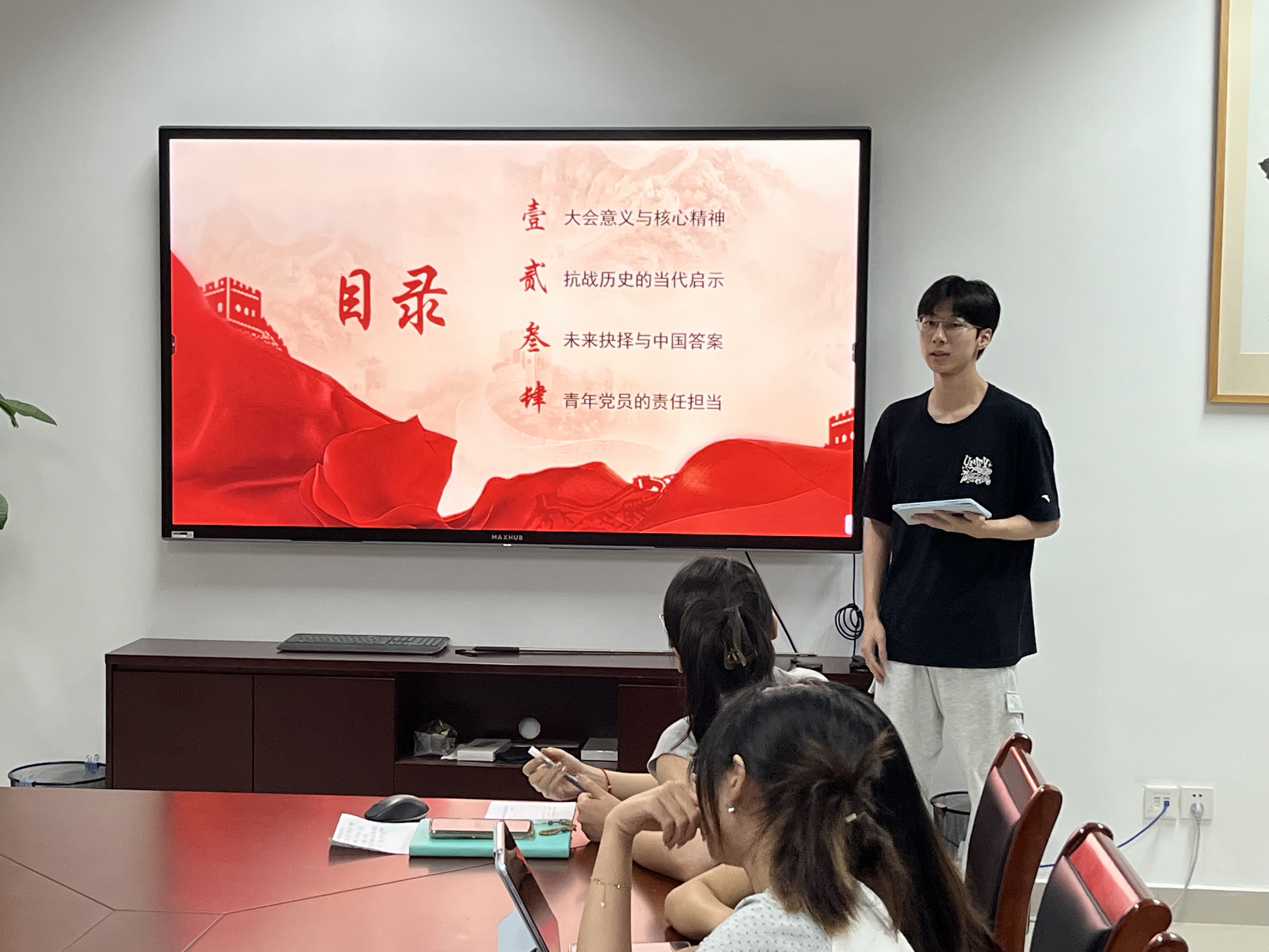 首先由林忠烨以“学习总书记在抗战胜利80周年大会上的重要讲话”为核心主题展开分享。林忠烨同志强调,总书记讲话中“铭记历史、缅怀先烈、珍爱和平、开创未来”的主题,既是对历史的告慰,更是中国坚持和平发展道路、推动构建人类命运共同体的庄严宣誓。引用总书记讲话,明确中国始终站在历史正确与人类文明进步一边,坚持和平发展与构建人类命运共同体;要求青年党员从坚定理想信念、立足专业学习、讲好中国故事三方面,传承伟大抗战精神,为强国建设、民族复兴贡献青春力量。