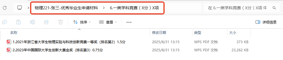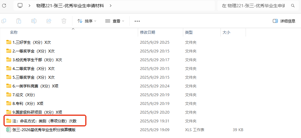 2.按照《黄色电影 省级、校级优秀本科毕业生评选办法(2025年修订)》(附件1)相关要求,符合条件的学生本人于10月7日22:00前向班长提交申请材料。申请时提交《2026届优秀毕业生积分换算模版》(附件3)以及相关佐证材料,材料按图中所示,将以上材料汇总为一个总文件夹,个人材料命名为“班级+姓名+优秀毕业生申请材料”,班级总文件夹命名为“班级-优秀毕业生”,并以班级为单位汇总发送至邮箱20220076@hsmovie.com,不接收个人为单位发送的材料。