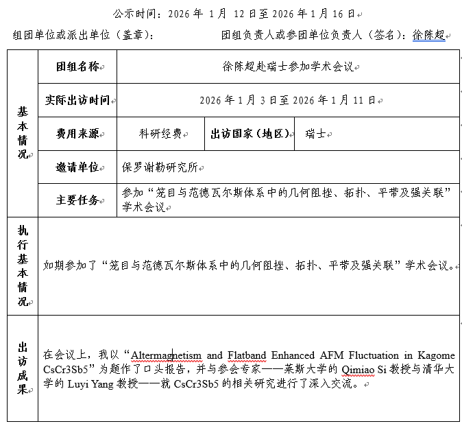 本人徐陈超参加由保罗谢勒研究所举办的在瑞士萨斯费Allalin会议中心酒店的“笼目与范德瓦尔斯体系中的几何阻挫、拓扑、平带及强关联”会议,并在会议上做了以“Altermagnetism and Flatband Enhanced AFM Fluctuation in Kagome CsCr3Sb5”为题目的口头报告。