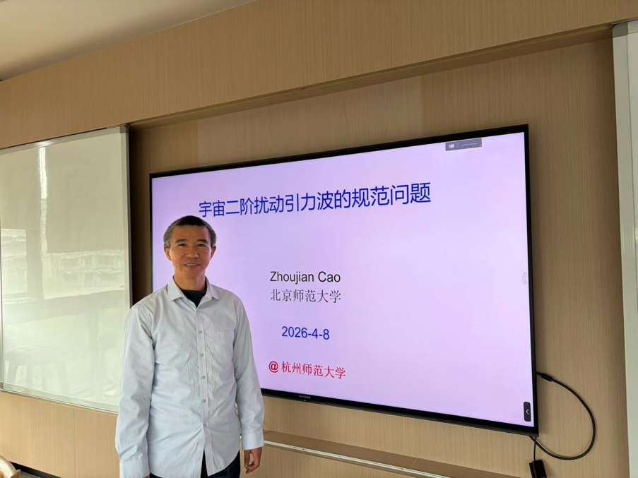 近日,北京师范大学曹周键教授应邀作题为“宇宙二阶扰动引力波的规范问题”的学术报告。作为引力波物理领域的活跃研究者,曹周键教授在报告中系统梳理了引力波物理实在性问题的历史脉络,并重点介绍了其团队在过去一两年里围绕宇宙二阶扰动引力波规范问题取得的最新进展。该报告吸引了众多相关领域学者和研究生参与,现场讨论热烈。