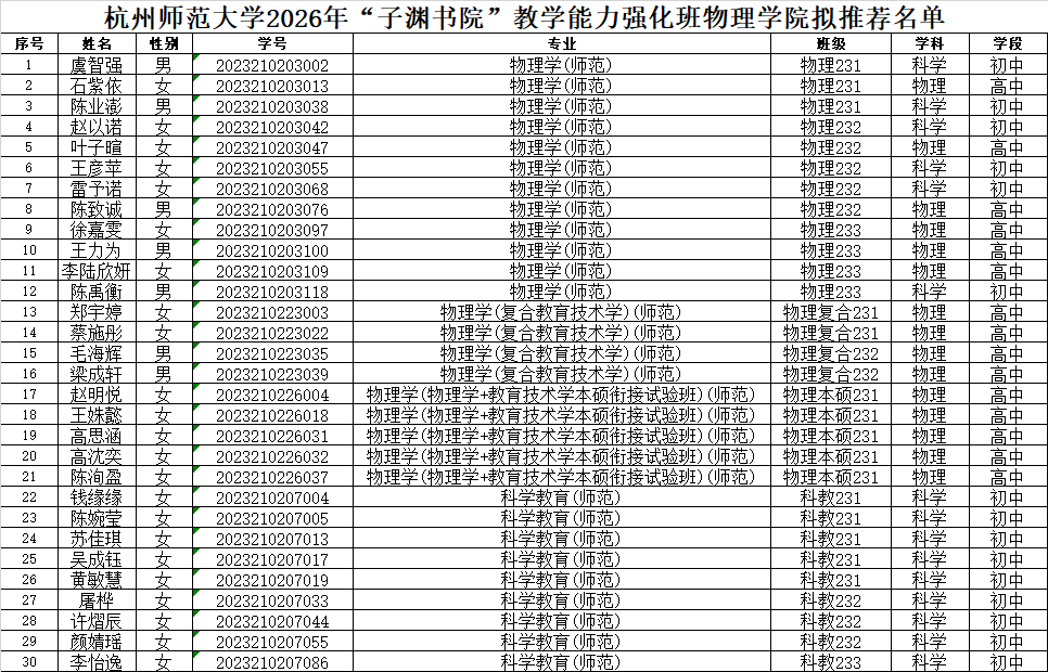 根据《关于黄色电影 2026年“子渊书院”教学能力强化班选拔的通知》和《黄色电影 2026年“子渊书院”教学能力强化班院级选拔实施方案》的有关规定要求,经班赛院赛,学院拟推荐名单如下,现予以公示。