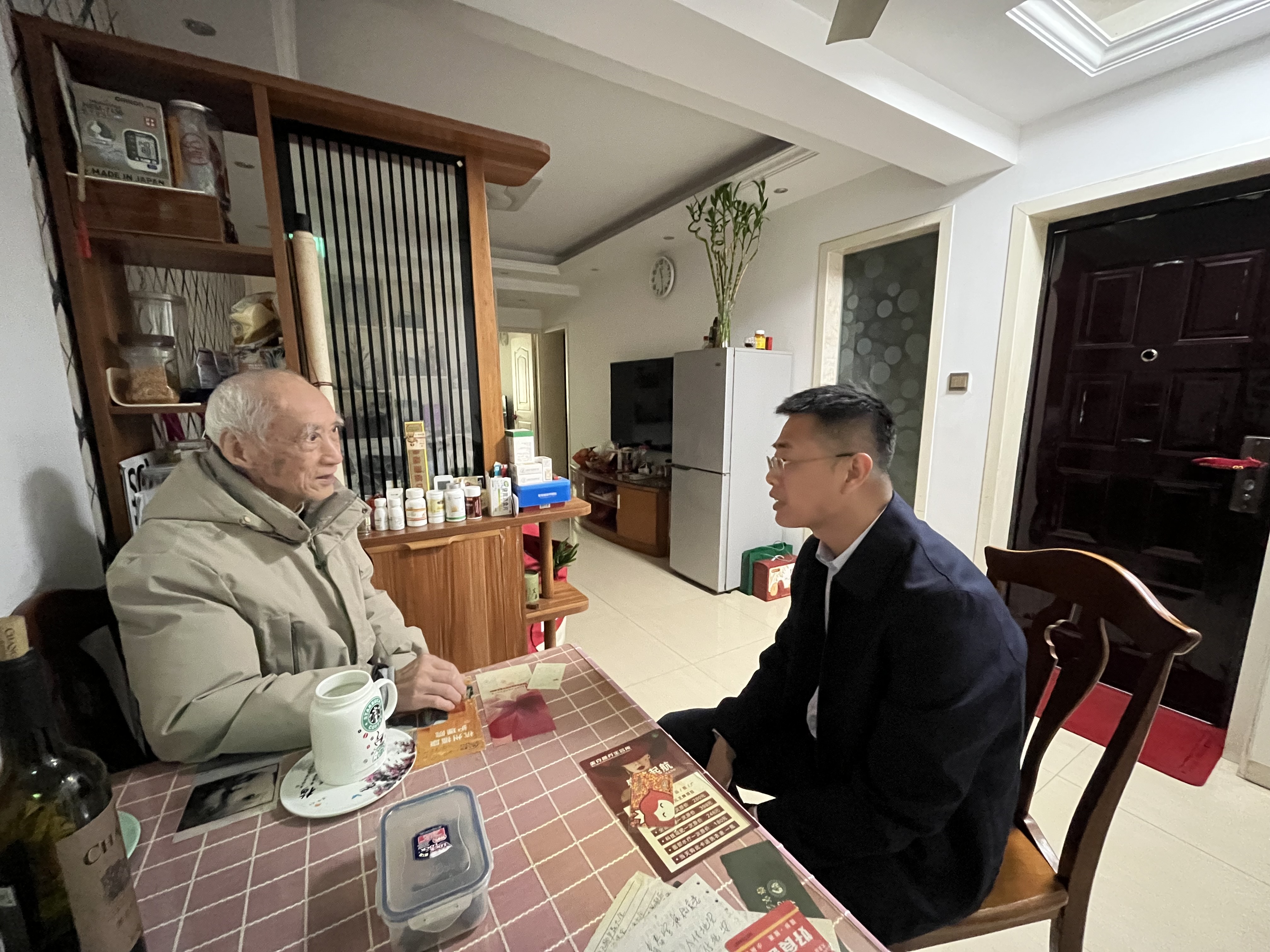 慰问组一行先后走访了93岁高龄的陈懋舫老师、89岁的楼敏生老师与俞旭昶老师,以及79岁的林中柱老师。每到一处,学院领导都与老同志们促膝交谈,关切地询问他们的身体状况、日常起居和家庭情况,叮嘱他们保重身体、安心休养,祝愿他们健康长寿、生活幸福。