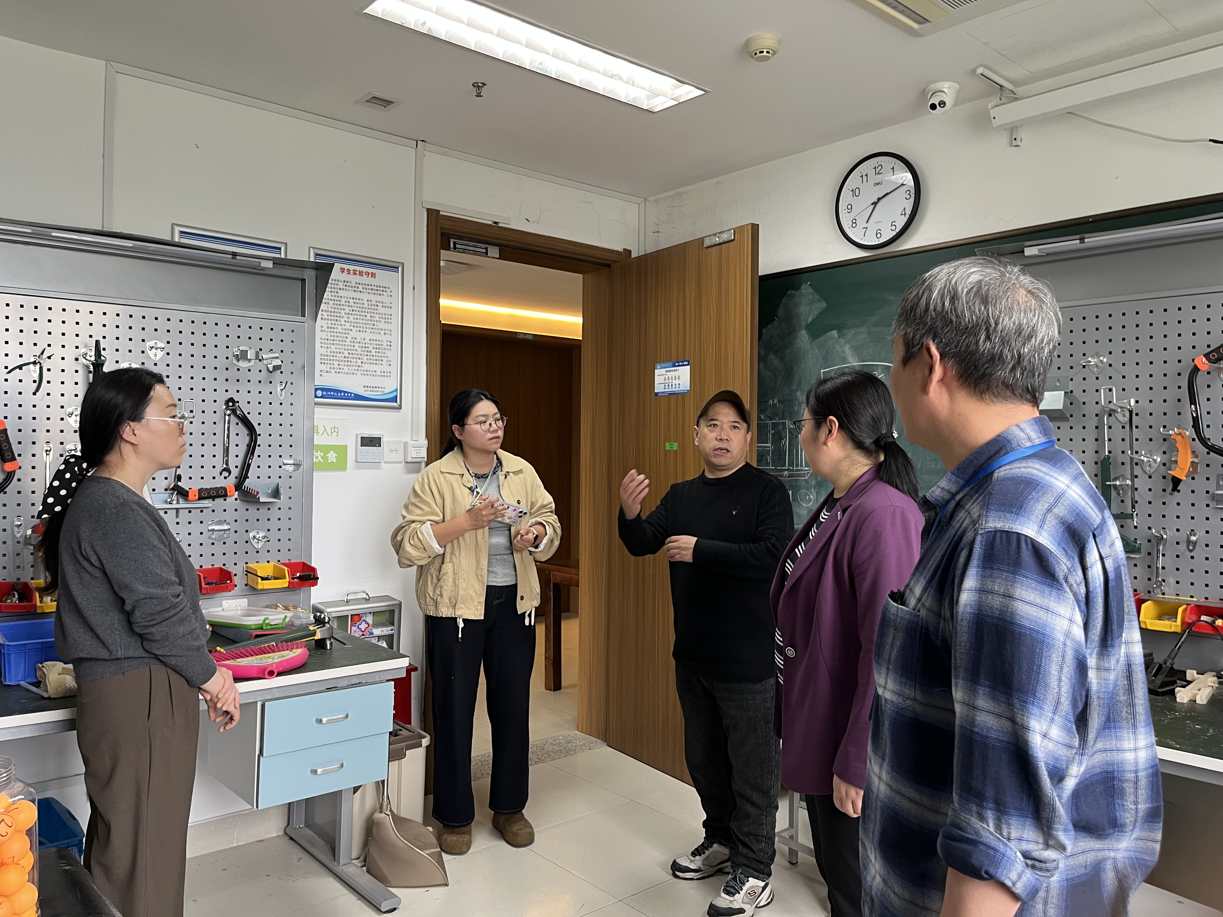 调研活动分为实地走访和座谈交流两个环节。徐院长一行首先参观了学院的光学实验室、演示物理实验室和创新制作实验室,详细了解实验室功能布局、设备配置及支撑学生创新能力培养的具体做法等。随后,双方在会议室举行座谈。侯红生院长代表学院对徐院长一行的到来表示热烈欢迎,并简要介绍了学院科学教育专业的基本情况和办学特色。大家围绕科学教育专业的人才培养方案、实践教学方面的经验与做法、科学教育实验室建设情况、校地合作共建思路与具体措施四个方面进行了深入交流。